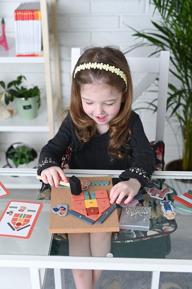 Igračka uči prepoznavanju oblika, ali prije svega razvija maštu i finu motoriku. A mogućnost rada s čekićem - to je zabava! Cijeli set je zapakiran u lijepo pakiranje, što osigurava sjajnu prezentaciju. U elementima su pripremljene rupe kako bi ih bilo lakše zakucati.