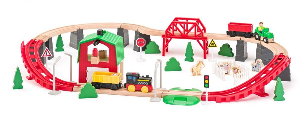 Negdje na slikovitoj farmi, usred zelenih livada i ptičjeg pjeva, život teče mirnim tempom. Svako jutro farmer ustaje kako bi se pobrinuo za životinje i pripremio sve za dolazak vlaka koji donosi svježe usjeve i odnosi robu u gradić. Električna lokomotiva sa zviždukom dolazi preko brežuljaka, dočekana radosnim mukom krava i rzajem konja. Ovaj izvanredni set željeznice s motivom farme omogućuje djeci da se prenesu u svijet gdje mogu graditi, igrati se i razvijati svoju maštu.
