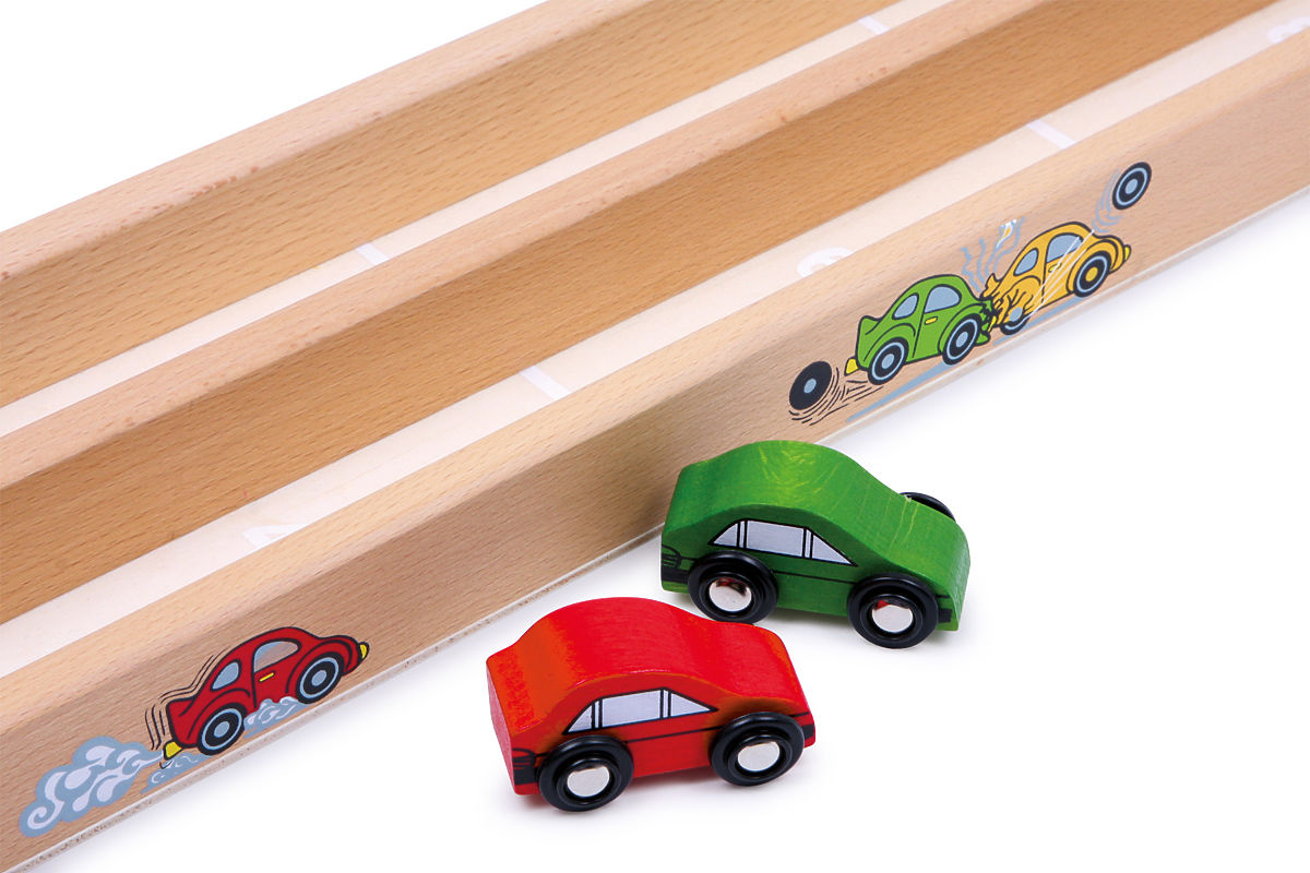 Dugačka utrkivačka rampa opremljena je gumenim lansiranjem. Samo povucite i auto će krenuti, a vi samo pratite koji autić uspije razviti veću brzinu. Sa strane ukrašena šarenim ilustracijama. Glavne značajke: rampa s dvije staze, 2 autića uključena u pakiranje