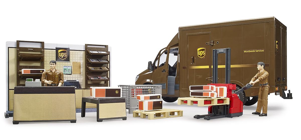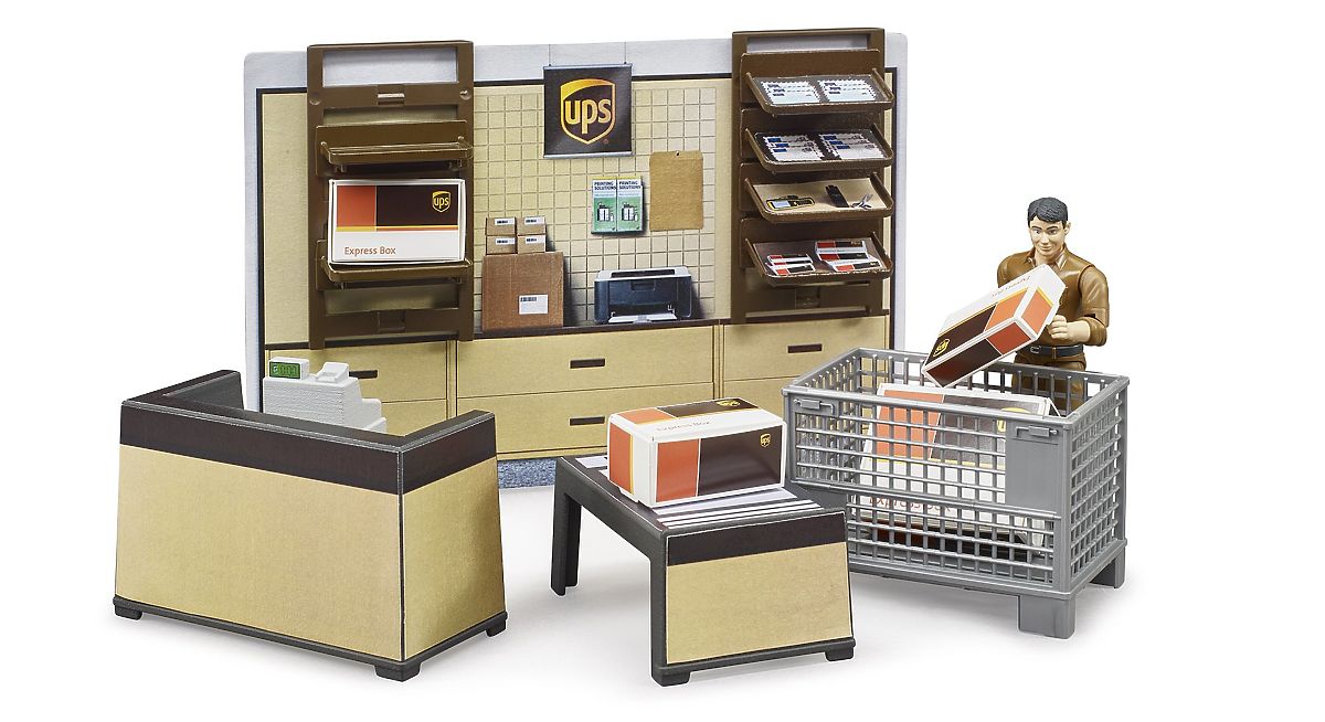 Poštanski ured UPS tvrtke BRUDER s opremom i figuricom. Možete preuzeti i predati pošiljke, kupiti transportne kutije i koristiti druge usluge. Zaposlenik .. više
