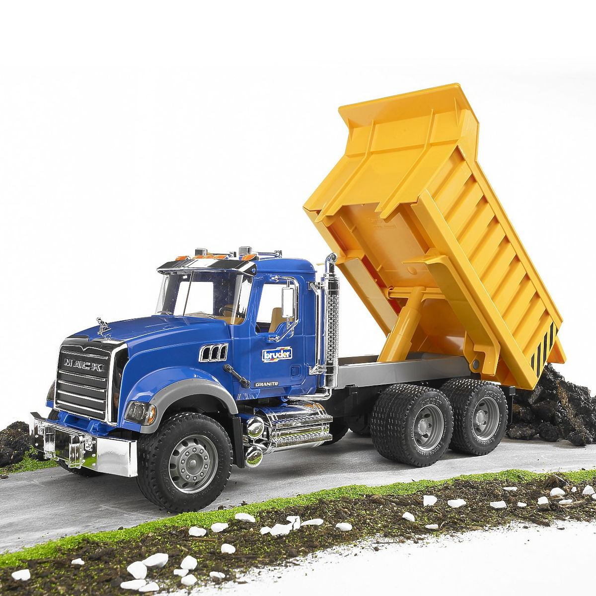 Bruder Kamion MACK Granit kiperi. Model američkog vozila MACK Granite s kromiranim dodacima ima preklopni prednji poklopac s mogućnošću pogleda na motorni blok, preklopna vanjska ogledala, prednje staklo izrađeno od visoko otpornog polikarbonata, otvarajuća vrata. Tu su i retrovizori, odbojnik, ispušna cijev i svjetla na krovu. Kiperi su lako upravljivi pomoću hidraulike, a stražnji zid je moguće otvoriti. Proizvedeno u Njemačkoj, od kvalitetnih materijala. Glavne značajke: preklopni poklopac motora, preklopna vanjska ogledala, otvarajuća vrata, proizvedeno u Njemačkoj