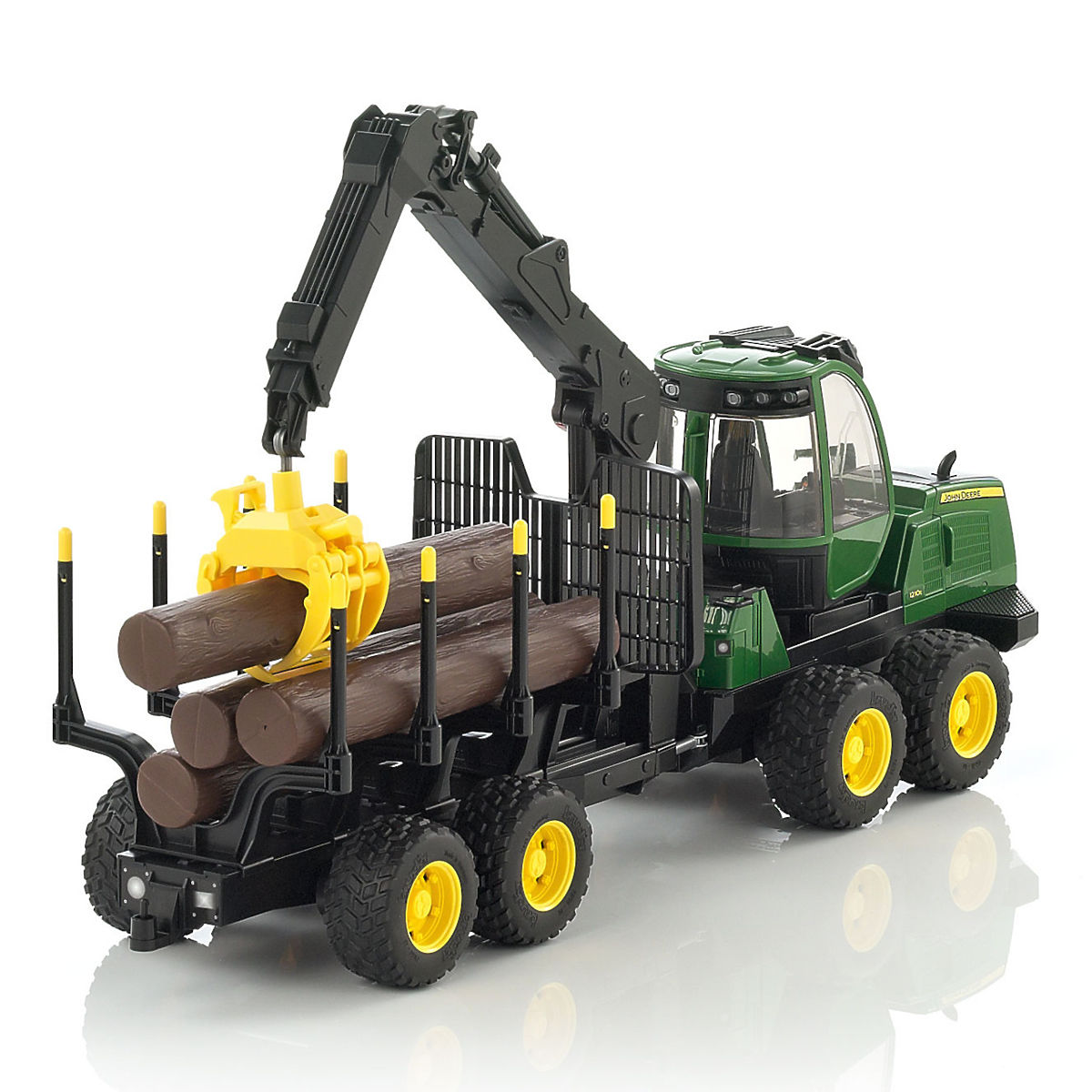 JOHN DEERE 1210E šumski traktor s prikolicom i utovarnom rukom ima otvarajuća vrata i poklopac motora. Kabina se može okretati za 360° i izrađena je od kvalitetnog neprobojnog polikarbonata. Funkcionalni utovarivač s hvataljkom za utovar drva, koji se također može okretati za 360°. Nadalje, ima pomične klanice, njihajuće četiri osovine za praćenje zahtjevnog šumskog terena. Šumski traktor ima na kraju dodatni priključak za spajanje dodatne prikolice. Vozilo uključuje 4 komada trupaca. Proizvedeno u Njemačkoj, od kvalitetnih materijala. Glavne značajke: otvarajuća vrata i poklopac motora, rotirajuća kabina i hvataljka za 360°, četiri osovine, vučna oprema, 4 komada trupaca, proizvedeno u Njemačkoj