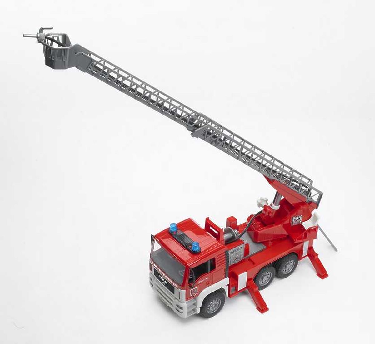 Bruder MAN TGA vatrogasci s pumpom za vodu je detaljan model vozila s čvrstim profiliranim gumama, potpuno sklopivom kabinom koja omogućuje pogled na motorni blok, opremljen je potpuno funkcionalnom pumpom za vodu i prskalicom, te velikim teleskopskim ljestvama. Ruka ljestava može se izvući do duljine od čak 80 cm! Platforma s teleskopskim ljestvama je rotirajuća, zrcala na kabini su sklopiva, a integrirani spremnik za vodu lako se puni. Četiri potpornja osiguravaju savršenu stabilnost za cijelo vozilo čak i s izvučenim ljestvama. Zanimljivost ovog vozila je moderni multifunkcionalni modul sa svjetlom i zvukom. Proizvedeno u Njemačkoj, od kvalitetnih materijala. Glavne značajke: potpuno sklopiva kabina, potpuno funkcionalna pumpa za vodu i prskalica, veliki teleskopski ljestve do duljine od 80 cm, rotirajuća platforma s teleskopskim ljestvama, sklopiva zrcala, moderni multifunkcionalni modul sa svjetlom i zvukom, proizvedeno u Njemačkoj