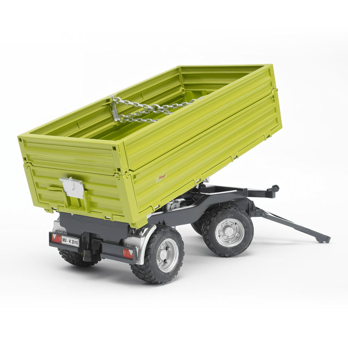 Bruder Fliegl kiperska prikolica s nastavcima je zelena, trostrana, detaljno razrađena varijabilna prikolica namijenjena za traktore serije 3000. Pomoću upravljačkog elementa na prednjem dijelu prikolice iznad vučnog uređaja možete upravljati smjerom kipanja teretne platforme. Položaj "sredina" kipuje klasično unatrag; položaj "lijevo" kipuje na lijevu stranu; položaj "desno" kipuje na desnu stranu. Kod kipanja lijevo ili desno, bočnu stranicu možete otvoriti pomicanjem poluge u smjeru vožnje. Prikolica ima vlastiti vučni uređaj, što omogućuje priključivanje dodatne prikolice i stvaranje zaista impresivnog skupa od dva ili više prikolica vučenih jednim traktorom. Prikolica ima mekane profilirane gume. Povišene bočne stranice moguće je demontirati. Proizvedeno u Njemačkoj, od kvalitetnih materijala. Glavne značajke: kipajući teretni prostor, otvorive bočne stranice, vučni uređaj, mekane profilirane gume, proizvedeno u Njemačkoj