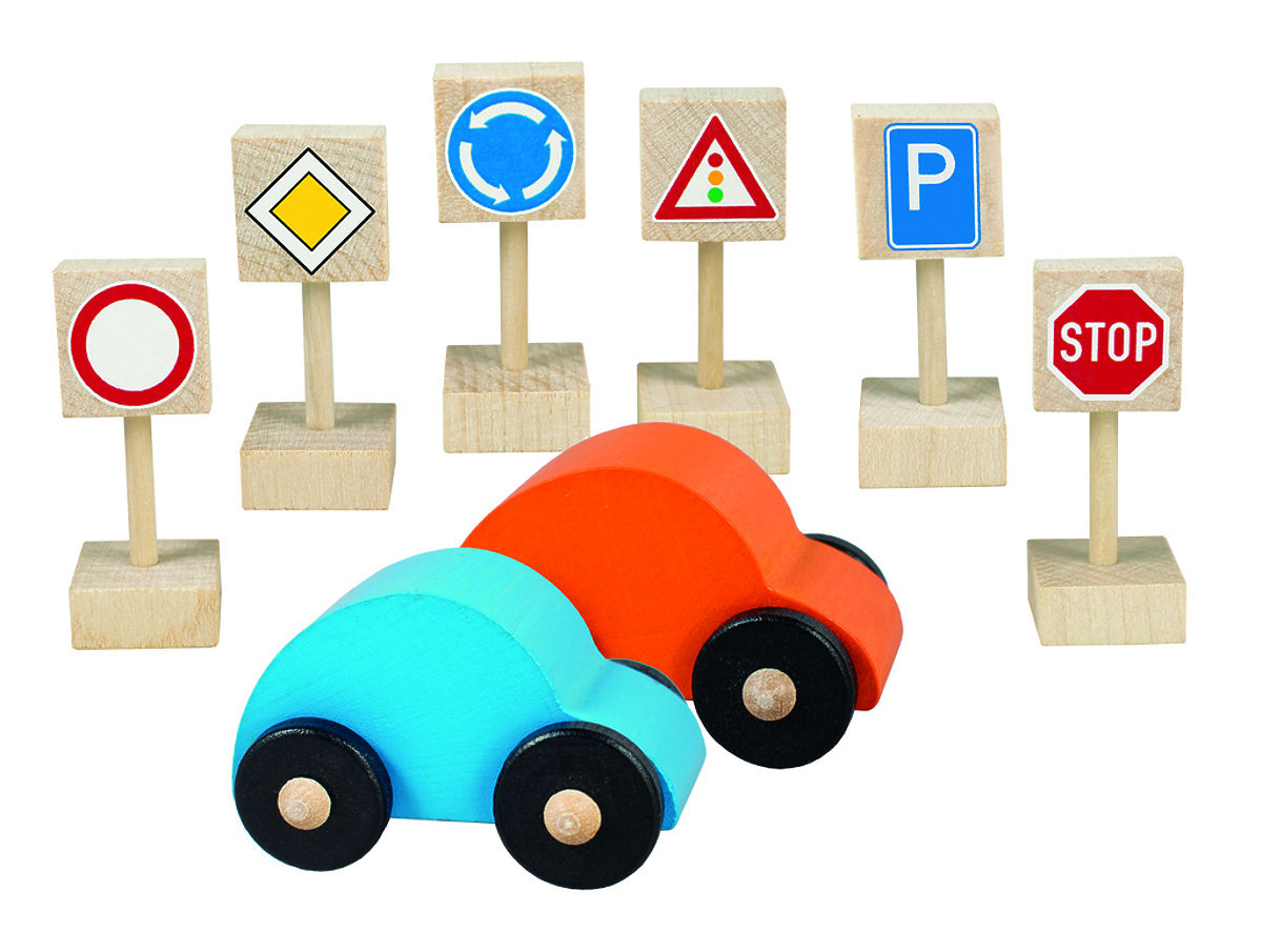 Sadrži: 2 drvena autića, 6 prometnih znakova