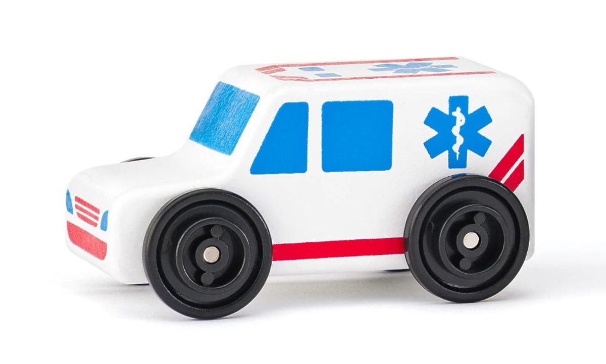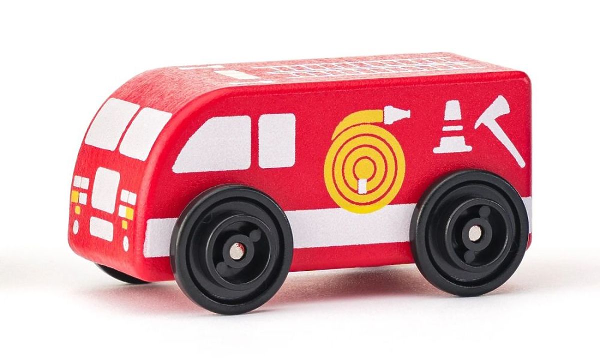Drvena vozila s gumenim kotačima idealan su dodatak drvenim vlakovima i ne samo to. U setu ćete pronaći vatrogasno vozilo, ambulantu, taksi, poštansko vozilo i autobus – svaki spreman za akciju! Lagana i izdržljiva konstrukcija prilagođena malim rukama, sigurna i jednostavna za upravljanje. Razvija maštu, podržava motoriku i potiče kreativnu igru. Odgovara većini setova drvenih vlakova.
