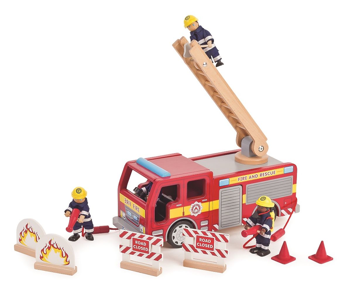 Drveni vatrogasni kamion s izvlačivim ljestvama i otvarajućim vratima. .. više