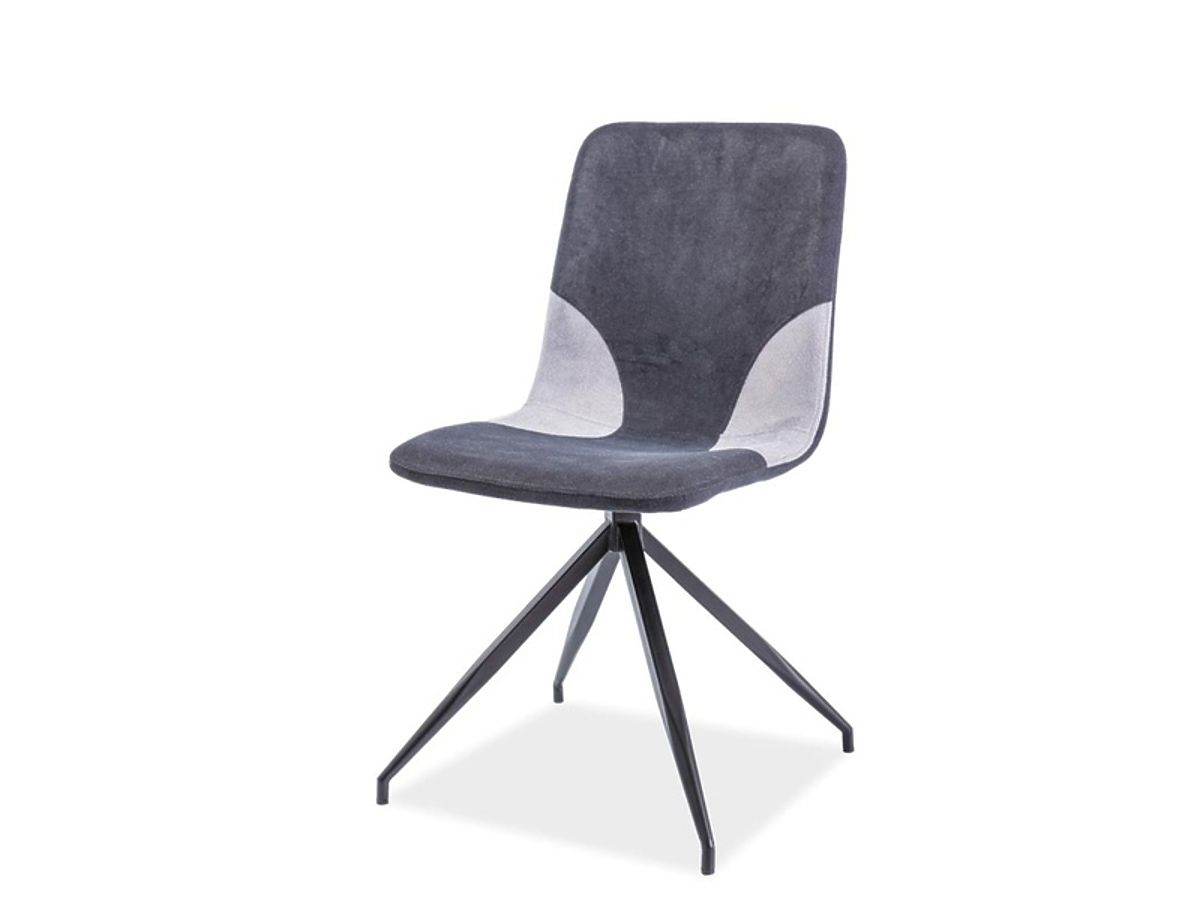 Židle stojí na kovové konstrukci, která je v lakovaná černou barvou. Čalounění sedáku a opěradla je z látky v šedé barvě, v kombinaci světlé a tmavé.