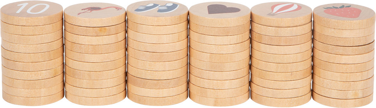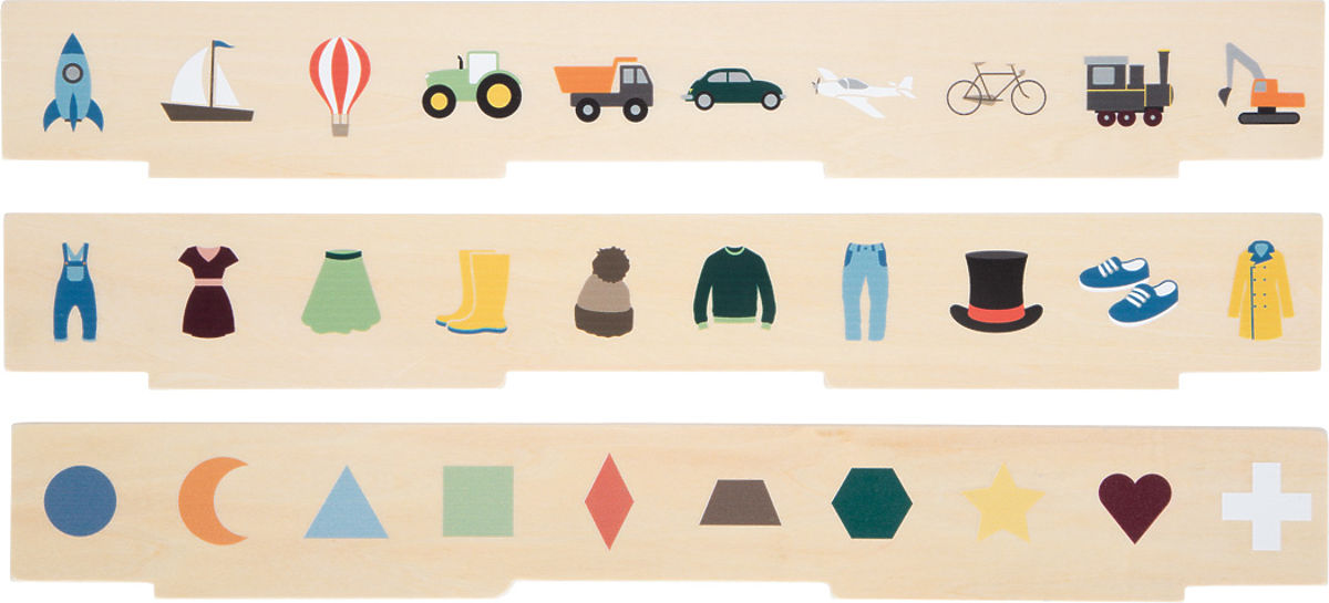 Ovaj drveni spremnik nudi mnogo motiva za otkrivanje s tri obostrana umetka i 60 komada žetona s motivima na temu prijevoza, životinja, brojeva, oblika, odjeće, .. više