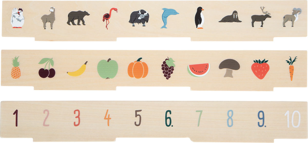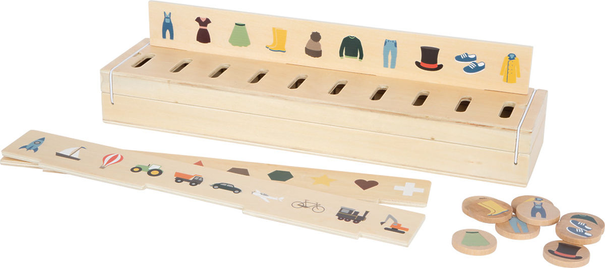 Ovaj drveni spremnik nudi mnogo motiva za otkrivanje s tri obostrana umetka i 60 komada žetona s motivima na temu prijevoza, životinja, brojeva, oblika, odjeće, voća i povrća. Djeca treniraju finu motoriku, prepoznavanje boja i oblika na zabavan način dok sortiraju i umeću žetone u kutiju. Motivi se također mogu koristiti za učenje riječi i poboljšanje rječnika na zabavan način. Deset zasebnih pretinaca unutar drvenog spremnika i dvije gumene kopče osiguravaju sigurno pohranjivanje sadržaja. Praktična edukativna igračka pogodna i za putovanja. Glavne značajke: tri obostrana slikovna umetka, mogućnost pohrane u zatvorivom spremniku, edukativna igračka pogodna i za putovanja, prepoznavanje boja i oblika na zabavan način, proširenje rječnika.