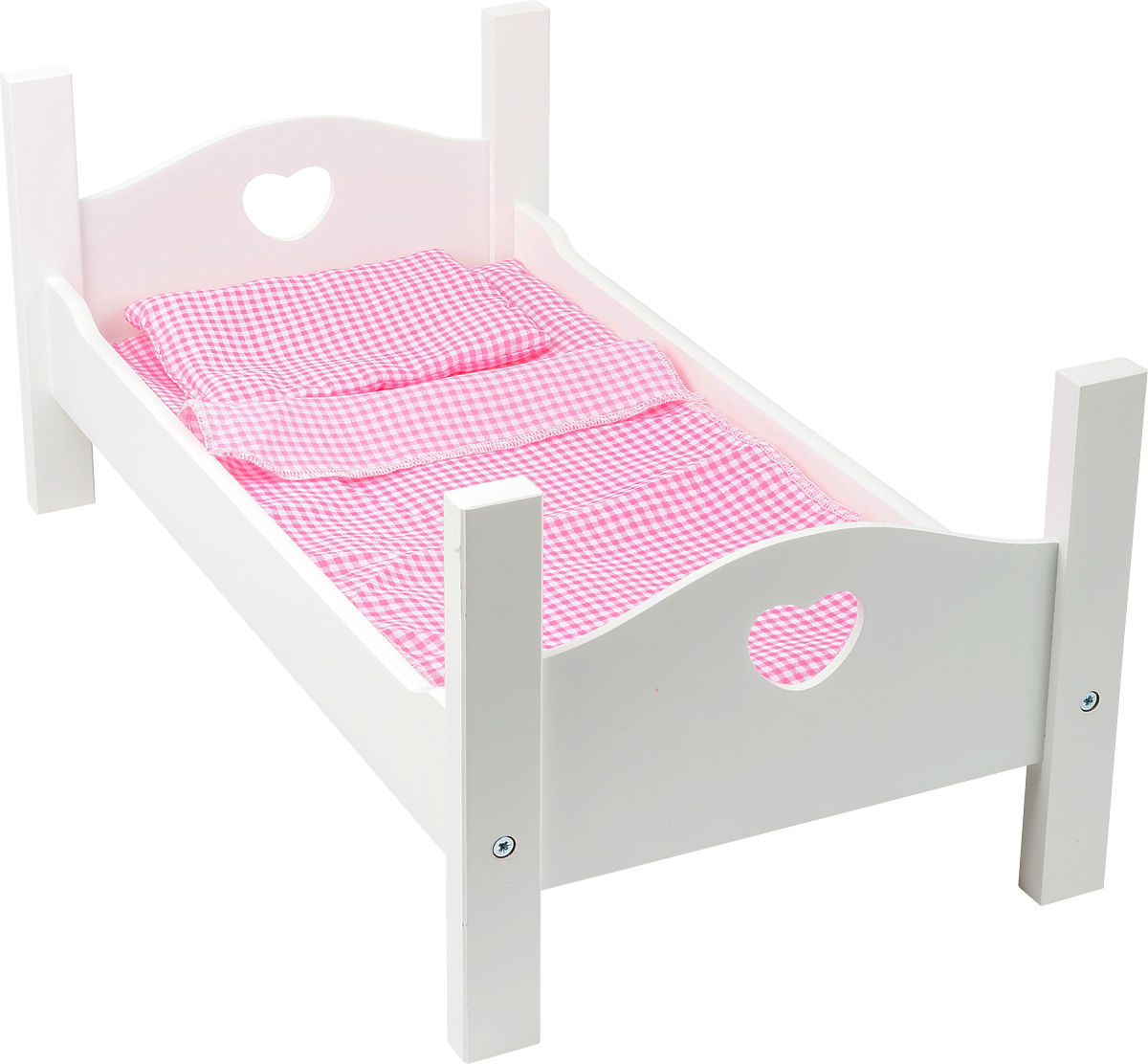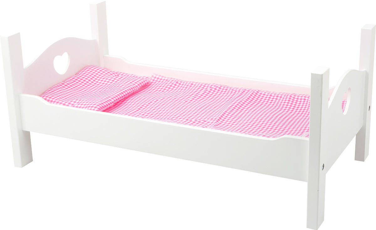 U ovom krevetiću lutka ili plišana igračka će slatko spavati! Moderan drveni krevetić bijele boje s detaljima srca na uzglavlju. Paket uključuje jastuk, deku i plahtu. Savršen dodatak setu namještaja za lutke. Glavne značajke: za lutke do veličine 45 cm, uključuje posteljinu
