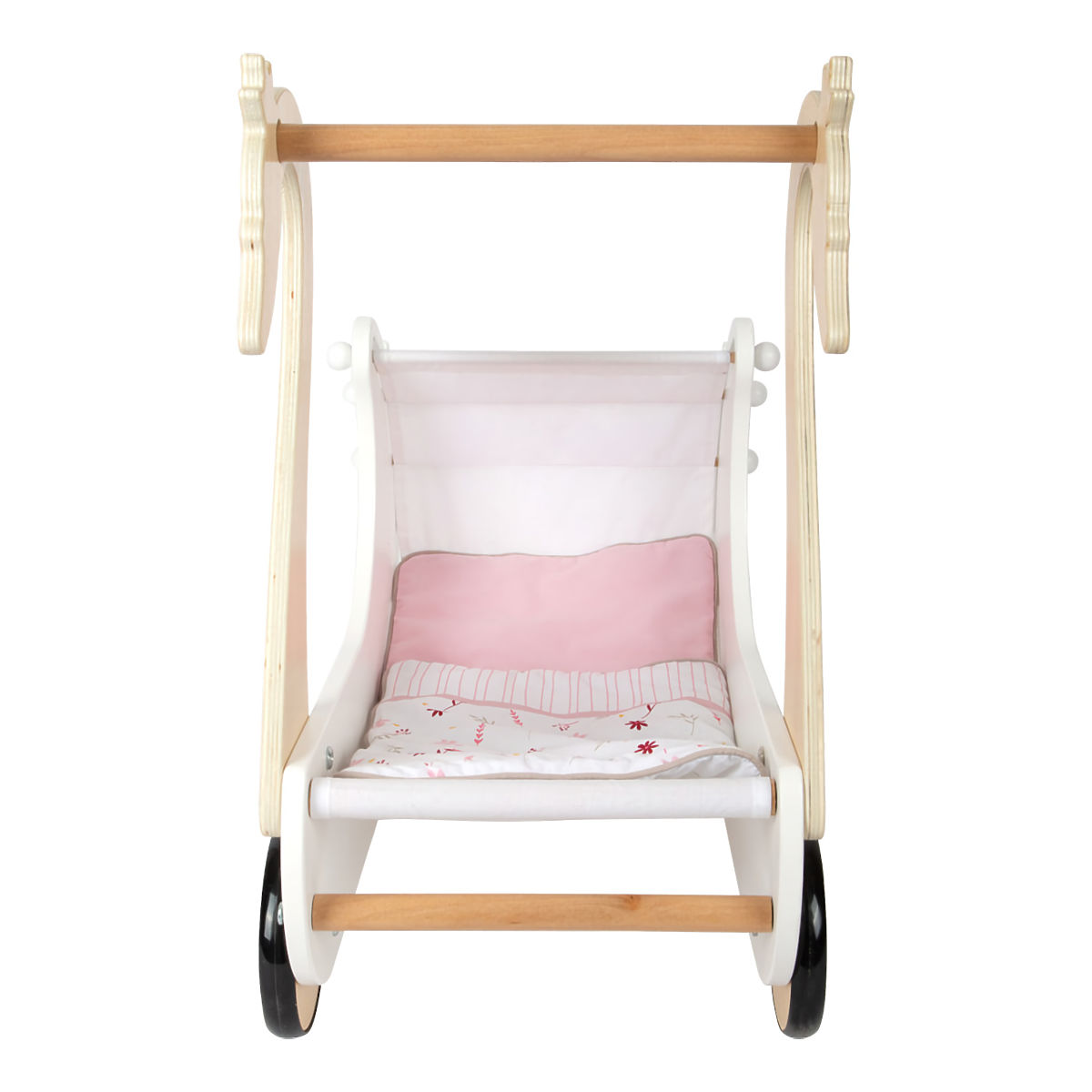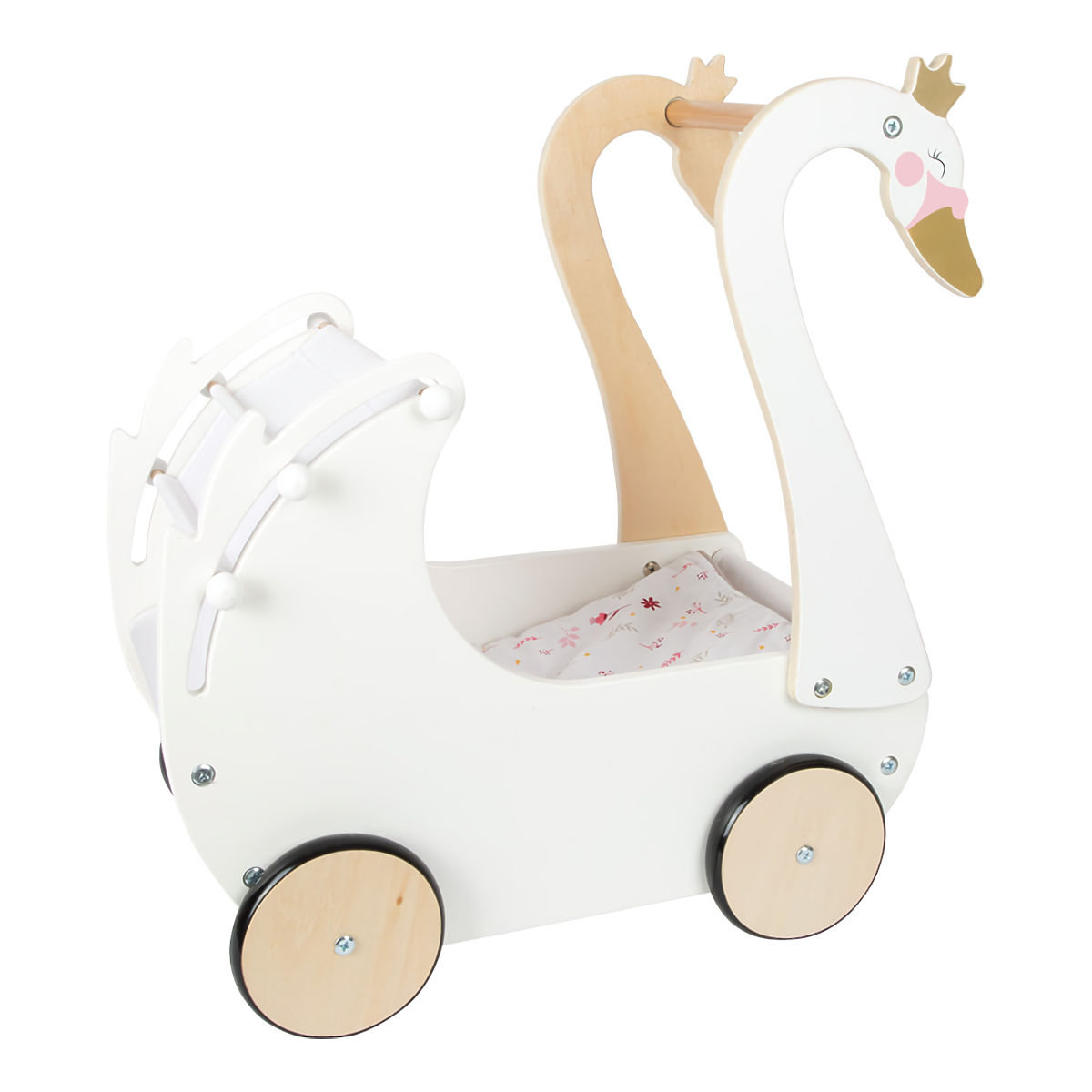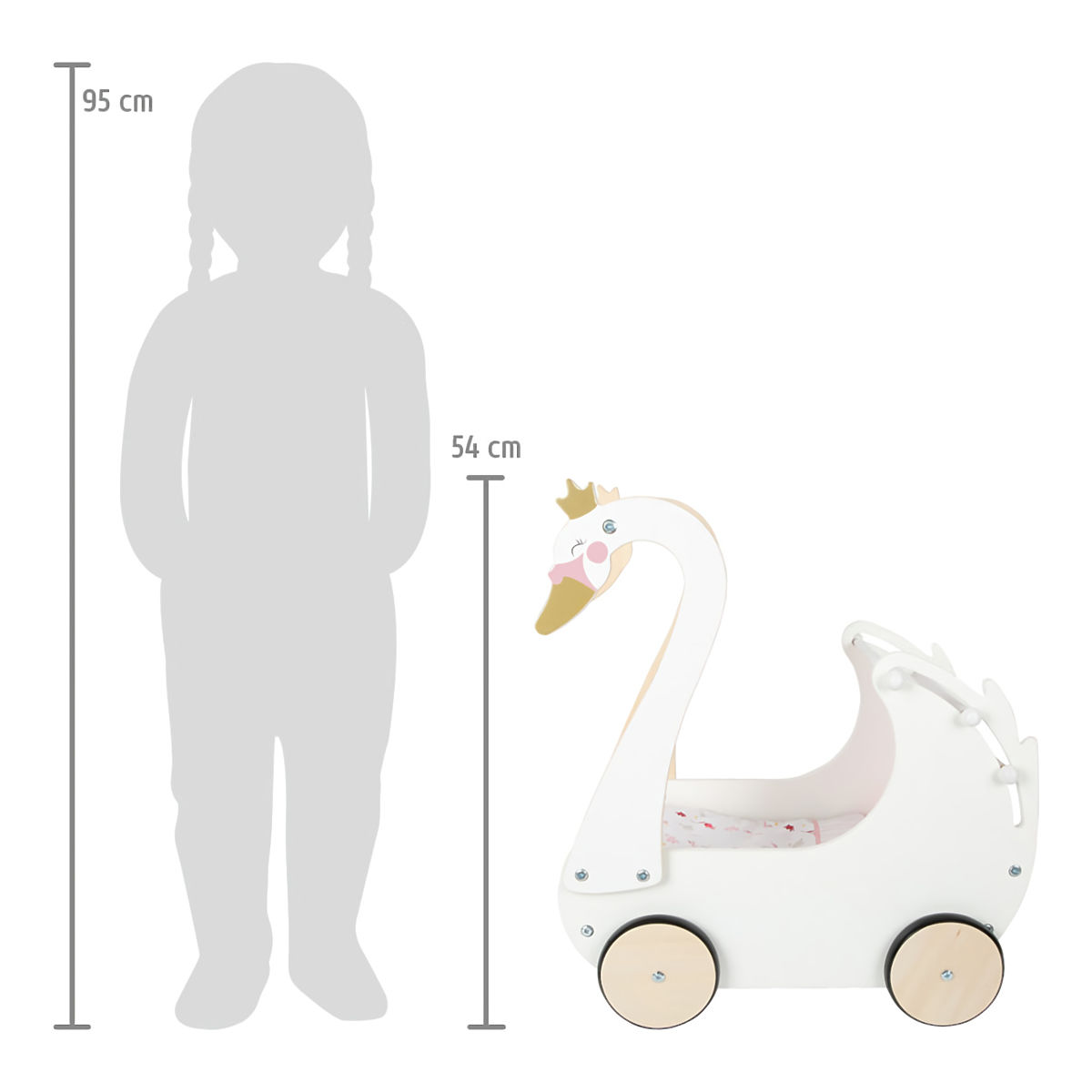 Brinite o lutkama s elegancijom labuda! Dopustite djeci da razvijaju maštu i socijalne vještine. Sa svojim profinjenim bojama i jednostavnim oblicima, kolica će lako nadopuniti svaku djevojačku sobu. Može primiti i lutke većih dimenzija, opremljena su sklopivom platnenom nadstrešnicom i dolaze s cvjetnom ružičasto-bijelom posteljinom. Gumeni kotači omogućuju tihi rad na svim vrstama površina i štite ih. Konstrukcija kombinira izdržljivu šperploču i posebno ugodno masivno drvo na dodir. Proizvod zahtijeva montažu, isporučuje se s detaljnim uputama za sastavljanje. Glavne značajke: kolica uključuju posteljinu za lutke visine do 46 cm, sklopiva nadstrešnica, tihi rad, izdržljiva drvena izvedba.