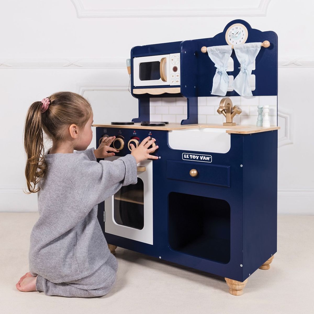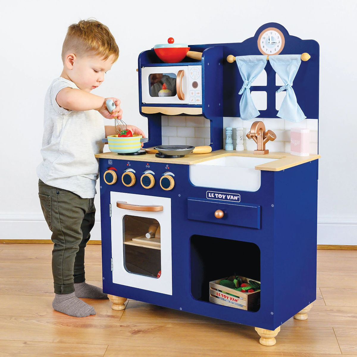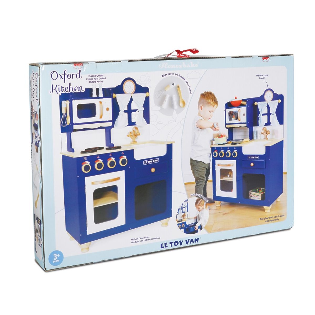 Kuhinja Oxford izrađena je od čvrstog i održivog drva, a originalni dizajn čini je jedinstvenim komadom. Obojana je u kraljevsko plavu boju, a detalji su u bakrenoj boji. Ova tradicionalna igračka uklapa se u svaku dječju sobu, potičući djecu na maštovitu igru uloga. Njene funkcije uključuju vrata pećnice koja se otvaraju, okretne gumbe, sudoper, mikrovalnu pećnicu, simpatičan prozor sa zavjesama i sat s pokretnim kazaljkama. U paketu se također nalaze metlica, kuhača, soljenka i papar. Sve za male šefove i šefice kuhinje. Kuhinju možete nadopuniti hranom i dodacima iz kolekcije Honeybake od Le Toy Van. Prekrasna igračka koja se može prenositi s generacije na generaciju. Igračke s namjerom: Sve igračke tvrtke Le Toy Van izrađene su s ciljem – da dugo traju. Dizajnirane s ljubavlju od strane iskusnih obrtnika koristeći etičke prakse i održive materijale koji su blaži prema našem planetu. Glavne značajke: drvena kuhinja s dodacima izrađena etički od održivog drva testirana prema najstrožim standardima obojana netoksičnim bojama na bazi vode potiče kreativnu i maštovitu igru pomaže u razvoju govora i socijalnih vještina podržava rani razvoj Kolekcija Honeybake: Igračke u ovoj kolekciji prikladne su za istraživanje, pomažu djeci u razvoju mašte, socijalnih i verbalnih vještina te kognitivnih funkcija. Tradicionalni dizajn s modernim detaljima zasigurno će zabaviti djecu. Honeybake je kolekcija Le Toy Van koja je osvojila najviše nagrada za dizajn, kvalitetu, sigurnost te obrazovnu i igračku vrijednost.