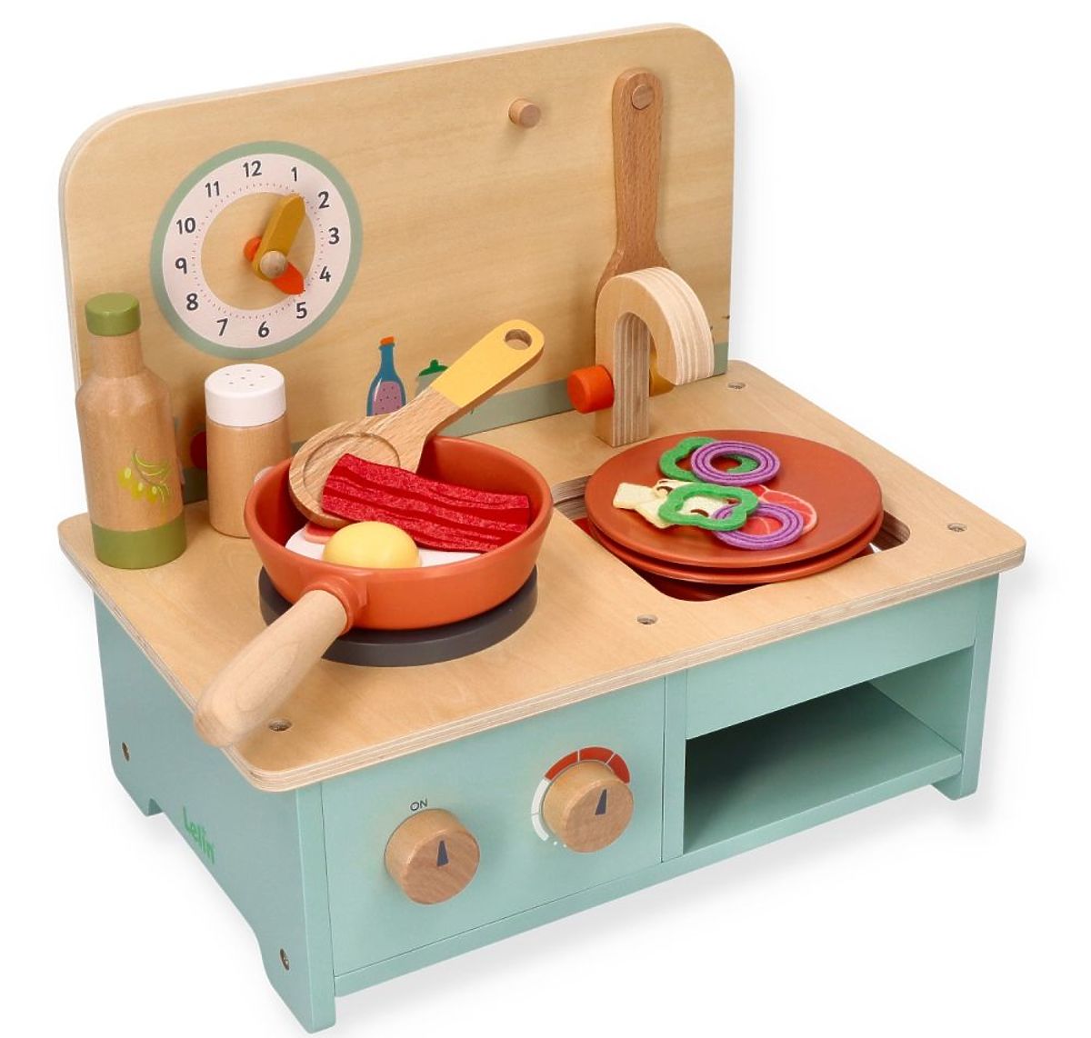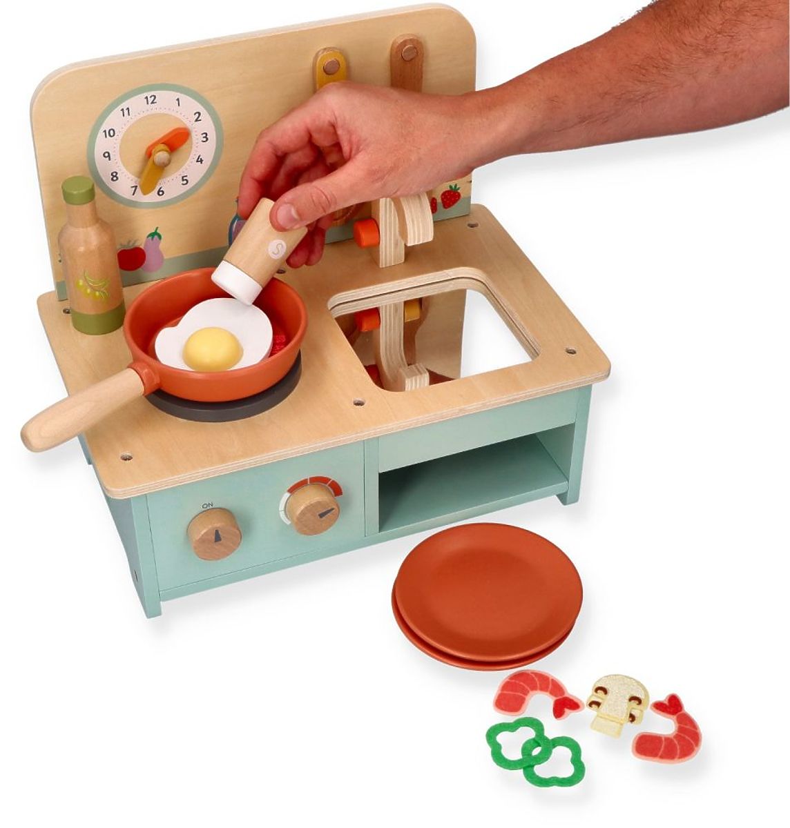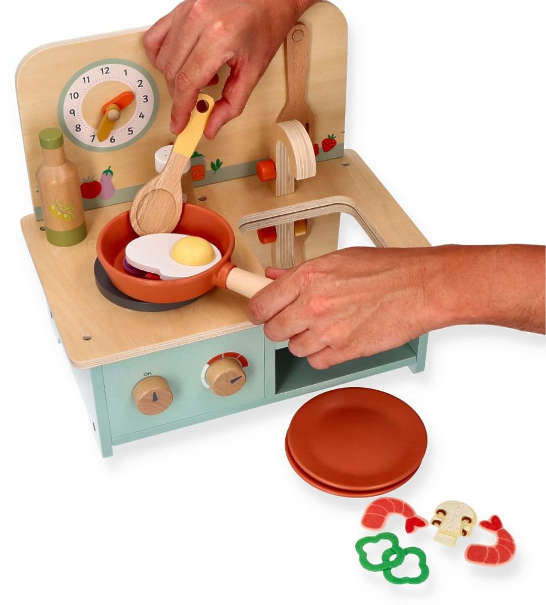 Kuhalo s priborom je savršena igračka za djecu koja vole oponašati odrasle i igrati se kuhanja. Set uključuje realistično kuhalo s gumbima, plamenikom, sudoper s pipom te osnovni kuhinjski pribor: tavu, žlicu, lopaticu, sol i ulje. Kuhinjica je također opremljena satom koji omogućuje kontrolu vremena "pripremljenih jela".