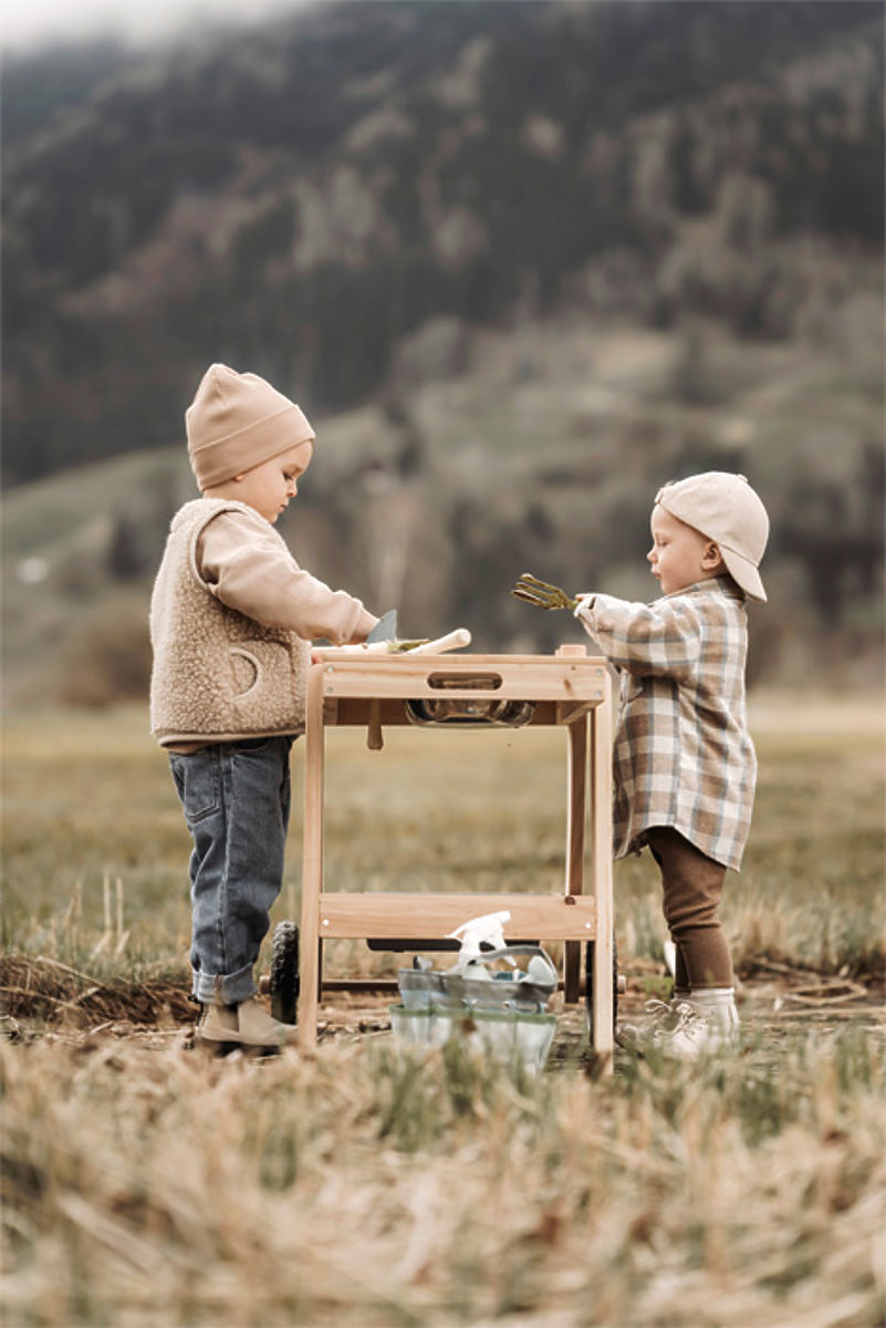 Isperite, kuhajte i gradite s vodom i pijeskom! Ova vanjska "ljetna" kuhinja za igru idealna je za mali vrt, terasu ili balkon. Unatoč kompaktnim dimenzijama, kuhinja nudi dovoljno prostora za kreativnu igru. Dolazi s dvije odvojive posude koje mogu pokrenuti cijeli građevinski i kulinarski proces. Ploča za kuhanje opremljena je okretnim gumbima i nizom otvora koji mogu poslužiti, na primjer, kao otvor za vodeno crijevo. Zahvaljujući robusnim kotačima, kuhinju je lako premještati. Prikladna je kao dodatak ili alternativa pješčaniku i za izradu najslađih "pješčanih" kolačića i drugih poslastica. Glavne značajke: idealna za mali vrt, terasu ili balkon, praktični ugrađeni otvori za igračke za pijesak ili vodeno crijevo, opremljena kotačima, lako premjestiva, neobrađeno drvo pogodno za osobne prilagodbe i lakiranje