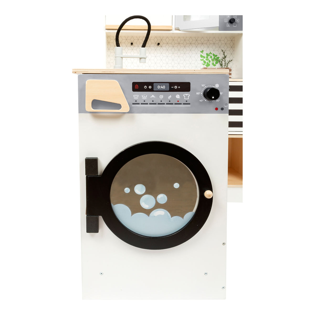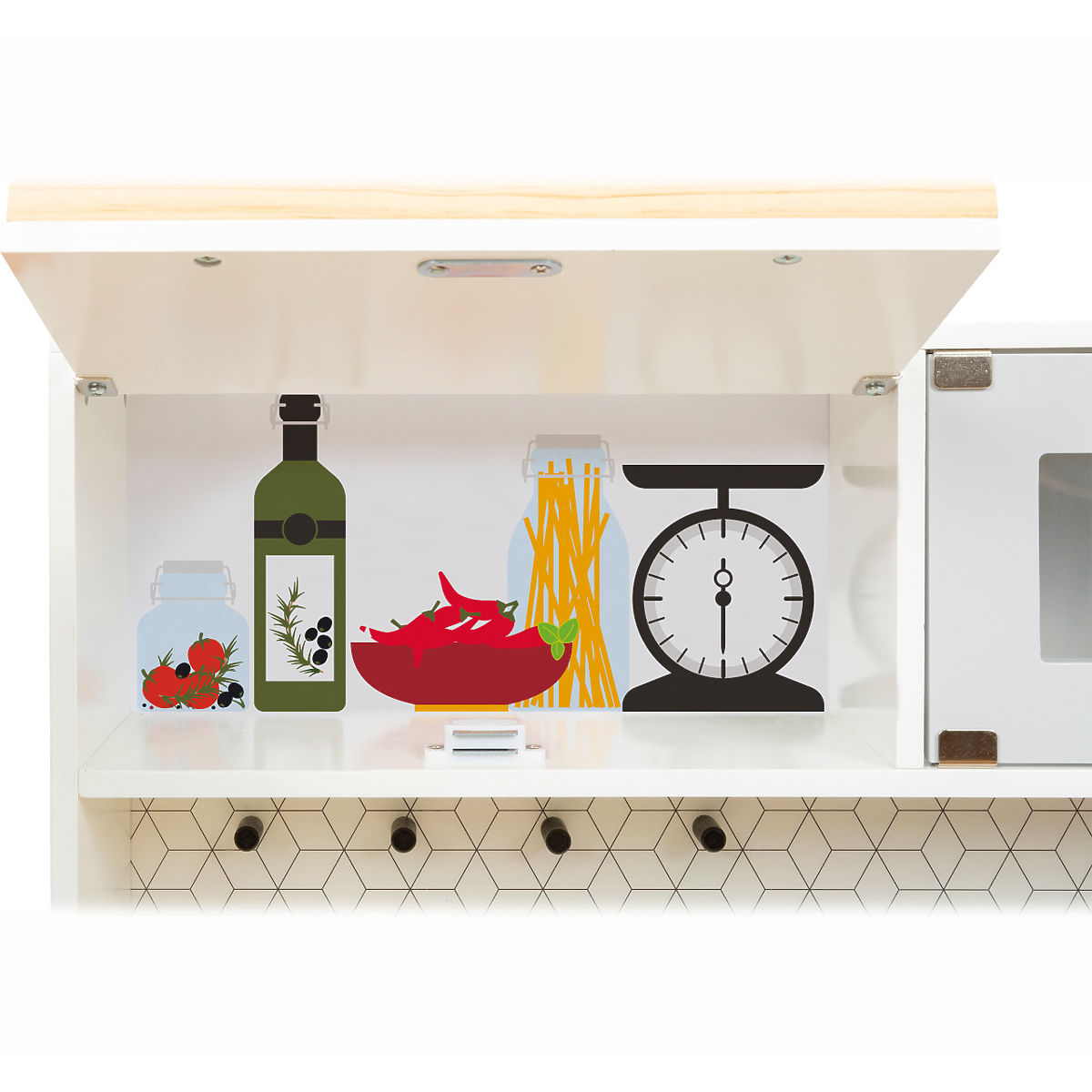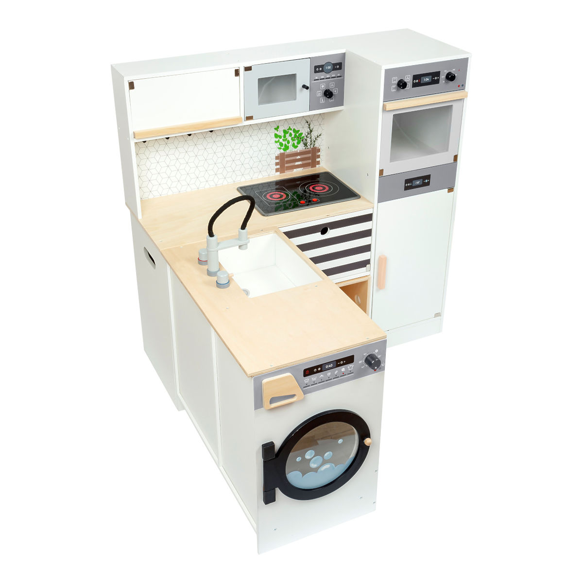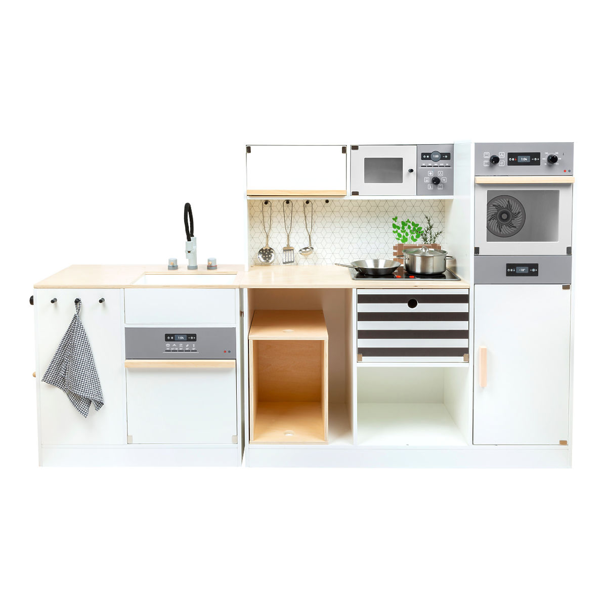 Za sve kuhare i domaćice! Ova velika, potpuno opremljena dječja kuhinja nudi sve uređaje moderne kućanstva. Zahvaljujući svom modularnom sustavu može se sastaviti kao kutna kuhinja ili kuhinjski blok s funkcionalnim otokom, pružajući tako mnogo prostora i mogućnosti za igru više djece istovremeno. Okretni gumbi klikaju, a ploča za kuhanje s baterijskim napajanjem (baterije nisu uključene) svjetlom i zvukom jamči realističan užitak u igri. Ormarići osiguravaju dovoljno prostora za pohranu i opremljeni su vratima. Uključuje visokokvalitetno posuđe izrađeno od metala. Za kuhinju je dostupno i mnogo dodatne opreme. Proizvod zahtijeva montažu, isporučuje se s ilustriranim uputama za sastavljanje. Glavne značajke: dječja kuhinja: štednjak, pećnica, mikrovalna pećnica, hladnjak, prostori za pohranu kuhinjski otok: sudoper, perilica rublja, perilica posuđa pribor: lonac, tava, okretni tanjur, žlica, kutlača, krpa svjetlosni i zvučni efekti (baterije nisu uključene) multifunkcionalna, raznolika upotreba robusna i izdržljiva izvedba