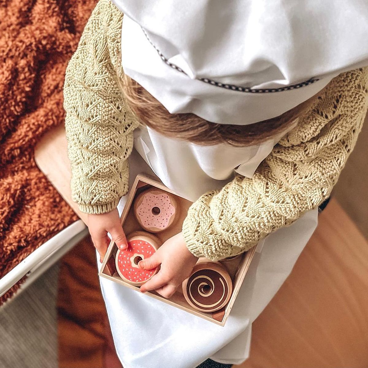 Drvena kutija s krafnama koje izgledaju realistično i vrlo ukusno. Možete ih pojesti sami ili podijeliti s drugima! Savršena igračka koja djecu upoznaje s mogućnostima izbora i dijeljenja. Idealna igračka za čajanke ili piknike. Potiče djecu na kreativnost i igru uloga. Izrađeno od kvalitetnih materijala iz odgovornih izvora. Zadovoljava europske sigurnosne standarde. Glavne značajke: kutija (bez poklopca) i 6 krafna, izdržljiva izrada, proizvedeno s obzirom na održivost.