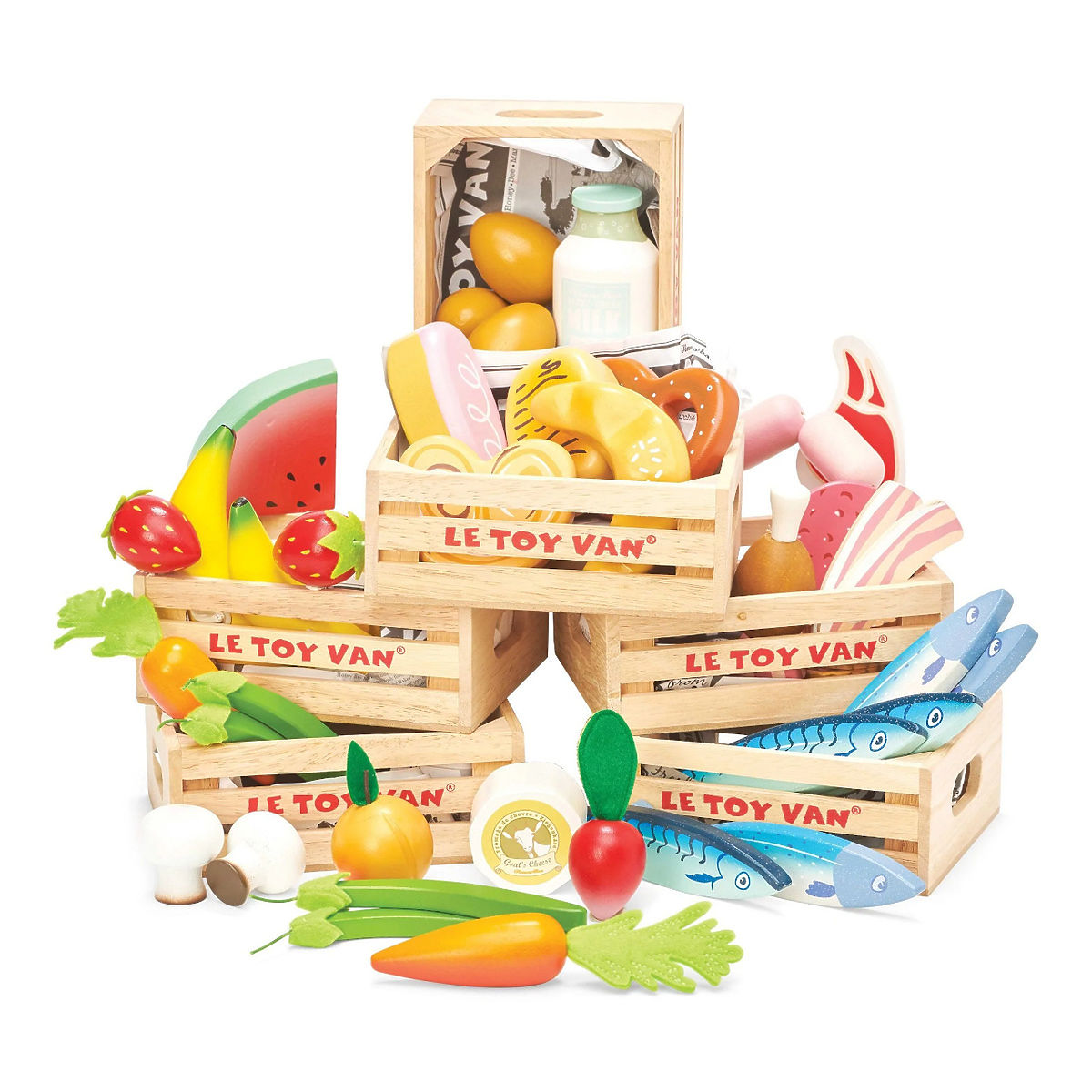 Kupujte pametno! Drveni sanduk sadrži svježe mlijeko, kockicu maslaca, čašu jogurta, kutiju vrhnja i 3 ukusna sira za sve ljubitelje mliječnih proizvoda. Savršen dodatak dječjim štandovima i kuhinjama na tržnici. Pristaje uz ostale Le Toy Van kutije, u kojima možete pronaći, na primjer, ribu, povrće, voće, meso ili jaja. Glavne značajke: Drveni sanduk za sir i mlijeko Kompatibilan s drugim Honeybake proizvodima - kuhinjska oprema, prodajni štandovi Igračka potiče kreativnost, maštu, pomaže u razvoju govora i društvenih vještina Izrađena od izdržljivog i održivog gumenog drva - dugotrajna zabava i briga za naše planet Obojan netoksičnim bojama, testiran prema najstrožim standardima Honeybake kolekcija Igračke iz ove kolekcije prikladne su za otkrivanje, pomoći će djeci u razvoju mašte, društvenih i verbalnih vještina te kognitivnih funkcija. Tradicionalni dizajn s modernim detaljima zasigurno će biti zabavan za djecu. Honeybake je kolekcija Le Toy Van koja je osvojila najviše nagrada za dizajn, kvalitetu, sigurnost, kao i obrazovnu vrijednost i vrijednost za igru.