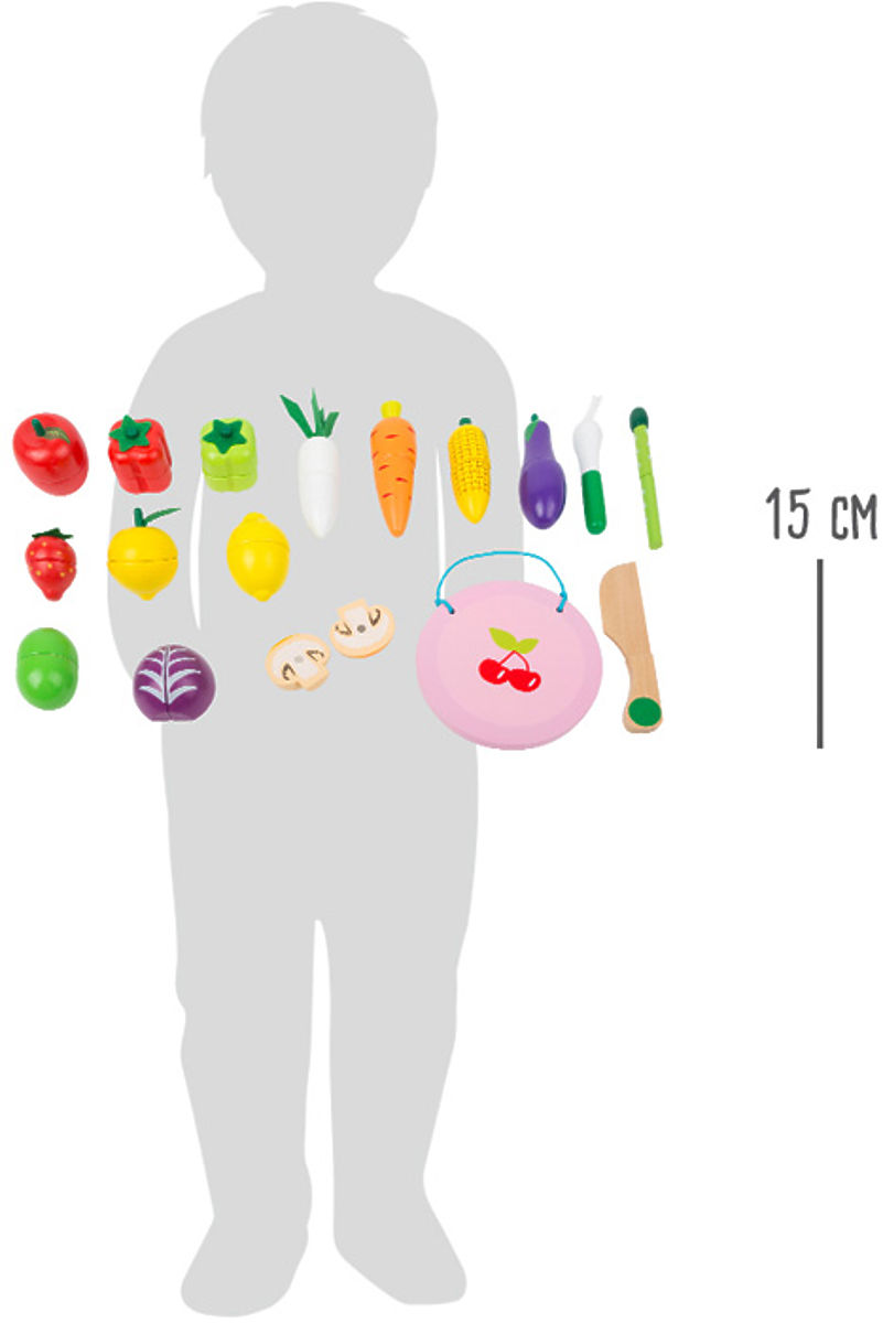Oštećena ambalaža proizvoda. Novi proizvod bez nedostataka. Ova mješavina voća i povrća ima što ponuditi. Različite vrste voća i povrća oslikane su tako da izgledaju kao prava hrana. Pojedini dijelovi drže se zajedno zahvaljujući čičak traci (osim mladog luka i šparoga). Nož za rezanje igračaka i drvena ploča su uključeni. To je ukusno iskustvo igranja koje također potiče kreativnost i maštu. Sve se može sigurno pohraniti u praktičnu cilindričnu ambalažu od čvrstog kartona. Ovaj set je idealan dodatak dječjim kuhinjama i trgovinama. Glavne značajke: potiče kreativnost i maštu, idealno i za putovanja.