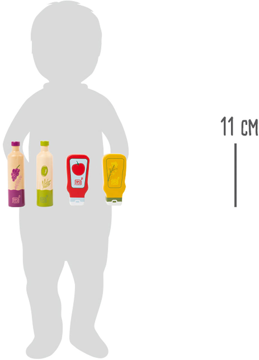 Pravi začini za dječju kuhinju! Set za igru sadrži bočice od kvalitetnog drva u tipičnim bojama proizvoda. Zahvaljujući izraženim ilustracijama na bočici, dijete lako prepoznaje njihov sadržaj. Set sadrži ocat, ulje, kečap i senf. Glavne značajke: set sadrži 4 komada, potiče maštu i igru uloga