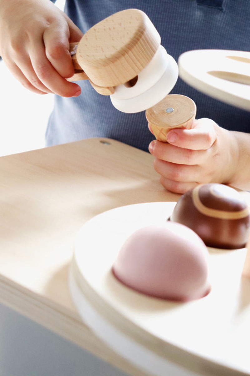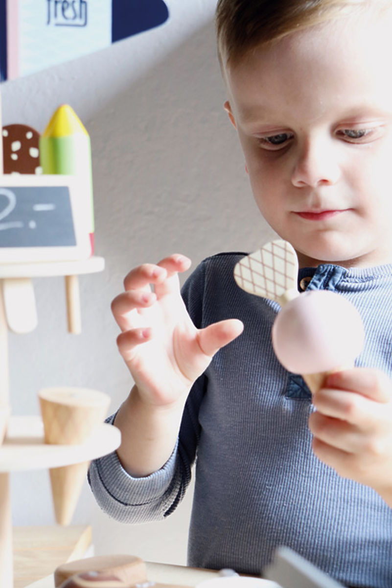 Žlica za sladoled s magnetskom funkcijom. 8 različitih vrsta sladoleda, od sladolednih štapića do ukusnog kuglastog sladoleda. Kuglice sladoleda su složive i opremljene magnetima. Srcoliki vafli i porcije šlaga za ukrašavanje sladolednih kreacija. Svi dijelovi sladoleda stanu u obojena mjesta na stalku. Rodno neutralna, nenametljiva shema boja s puno vidljivog drvenog materijala. Dolazi s pločom za pisanje kredom. Savršen dodatak multifunkcionalnoj trgovini i ostalim igračkama za igru iz Fresh linije proizvoda. Glavne značajke: Dijelovi su opremljeni magnetima, Sve ima svoje mjesto na stalku, Razvija komunikacijske i socijalne vještine djeteta
