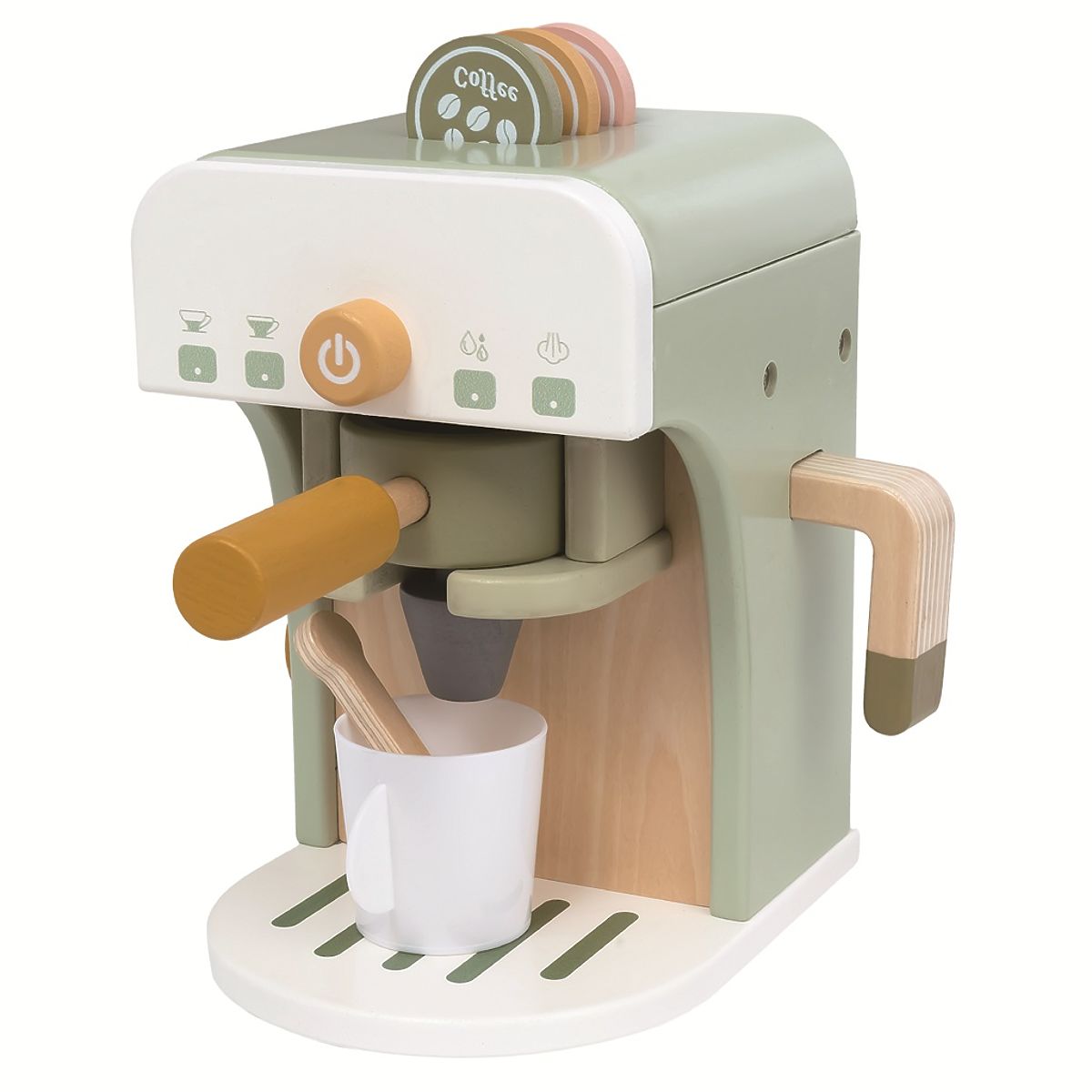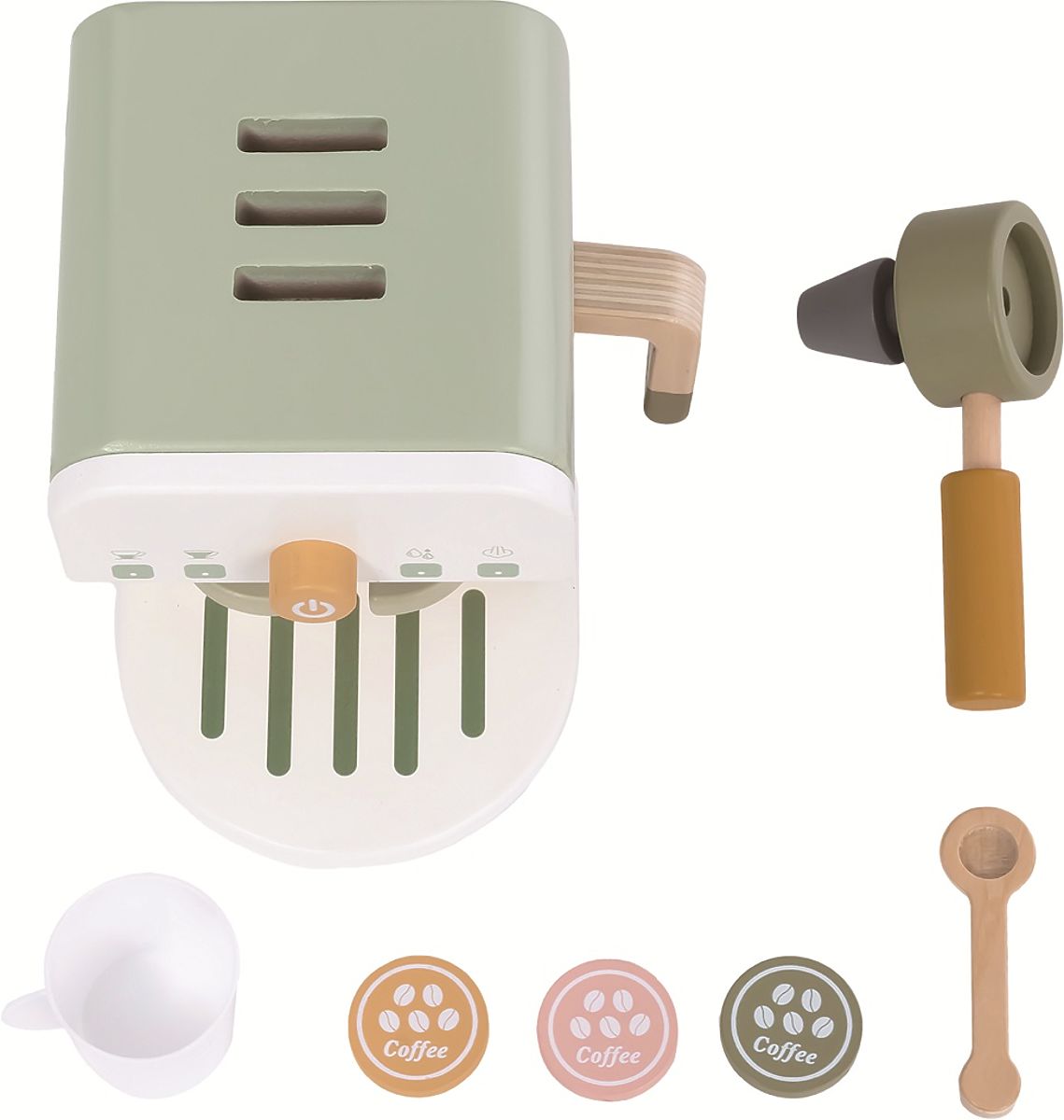 Set aparata za kavu s dodacima za sve male bariste i buduće ljubitelje kave. Želite li espresso ili cappuccino? Drveni aparat za kavu s realističnim detaljima ima tri zamjenjive kapsule, šalicu, žličicu i naravno ručku za kavu koja se može umetnuti izravno u uređaj. Djeca mogu pohraniti kapsule u utore na gornjoj strani aparata za kavu. Igračka potiče maštovitu igru, razvija finu motoriku, koordinaciju pokreta i socijalne vještine. Djeca se mogu igrati sama ili posluživati goste u vlastitom kafiću. Ugodne pastelne i zemljane nijanse boja zajedno s kvalitetnim prirodnim drvetom čine ovu igračku prekrasnim dodatkom svake sobe. Sadržaj paketa: aparat za kavu, ručka za kavu, 3 kapsule, šalica, žličica. Glavne značajke: aparat za kavu s dodacima, realističan dizajn i funkcionalni detalji, potiče maštovitu igru, razvija finu motoriku i koordinaciju, prirodno drvo u kombinaciji sa zemljanim tonovima, idealan dodatak dječjoj kuhinji, prikladno za djecu od 2 godine.