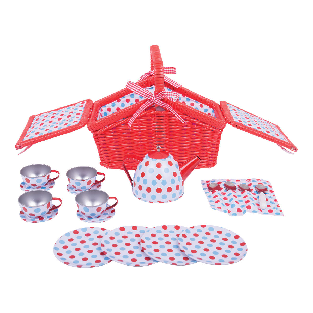 Ovaj prekrasni točkasti čajni set sadrži crvenu pletenu košaru u kojoj se nalaze četiri šalice, četiri tanjurića, čajnik s odvojivim poklopcem i četiri žličice u pakiranju. Set sadrži sve što djeca trebaju za čajanku. Glavne značajke: pogodno i za putovanjaodličan način za poticanje kreativnosti i idejaodgovara trenutnim europskim sigurnosnim standardima