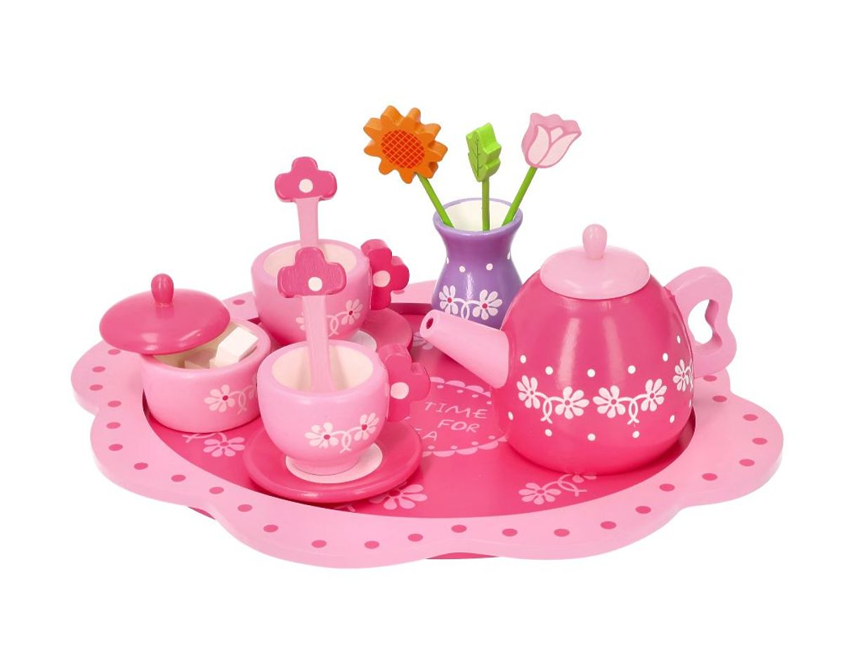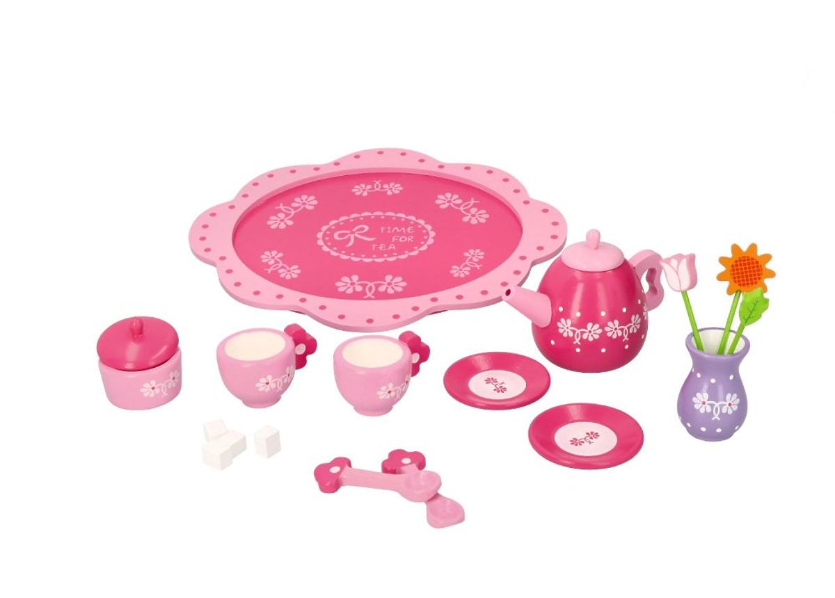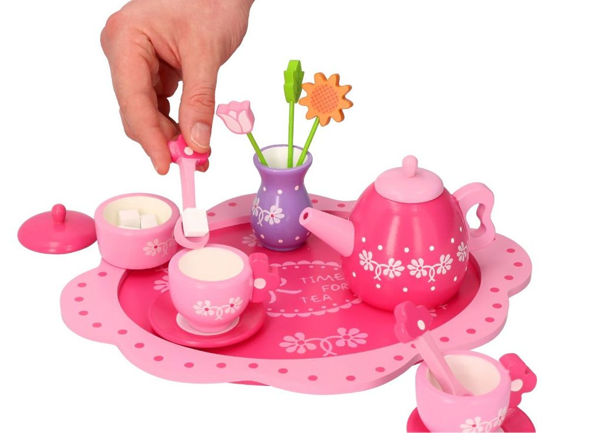 Izvrsni drveni čajni set pružit će djeci mnogo sati nevjerojatne zabave. Čajni set je idealan za piknik na svježem zraku, ali i za igru u sobi male dame. Kocke šećera u šećernici, šalice i čajnik učinit će da se svaka djevojčica osjeća kao prava dama koja priređuje čajanku. Cijeli set se lako prenosi na drvenom pladnju.