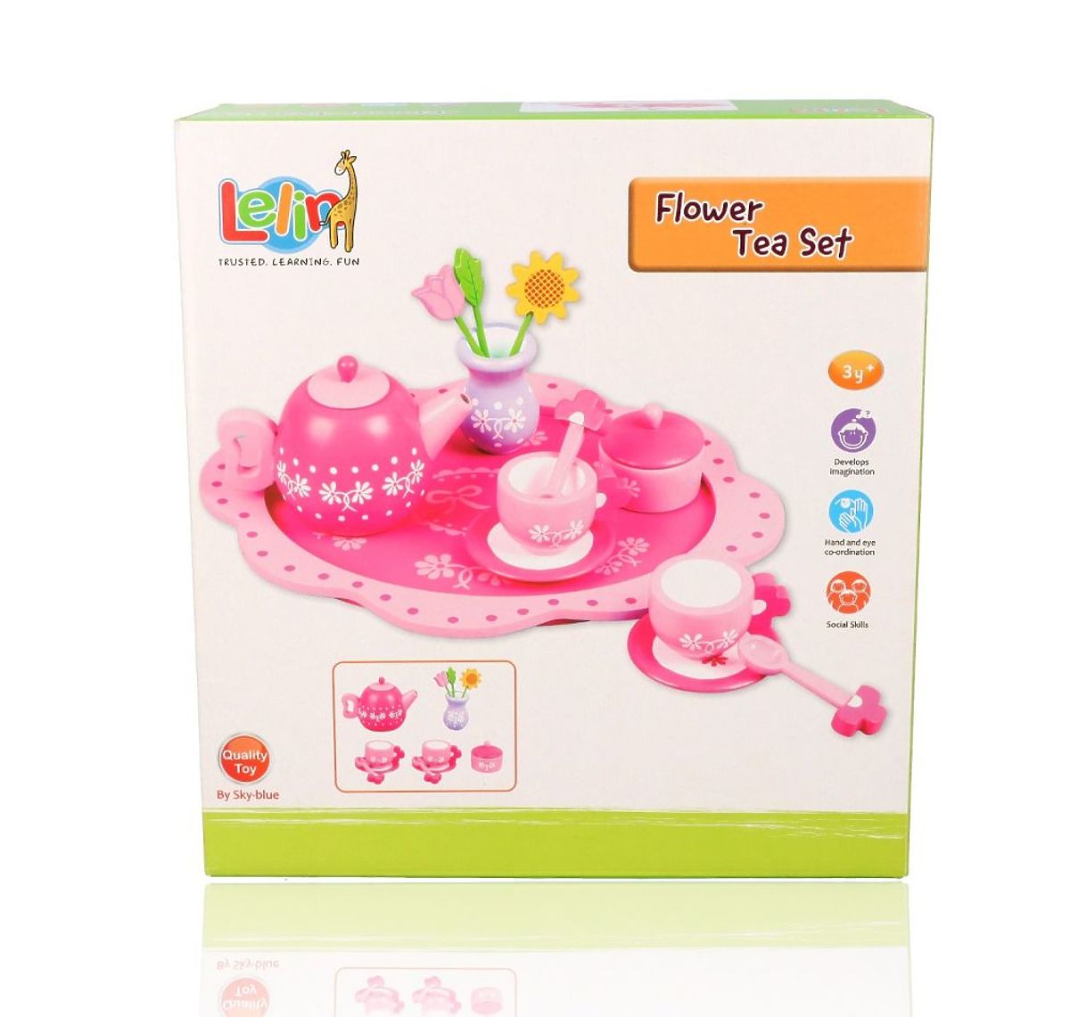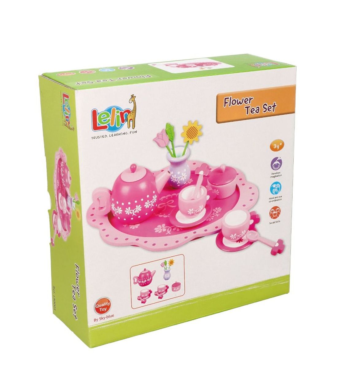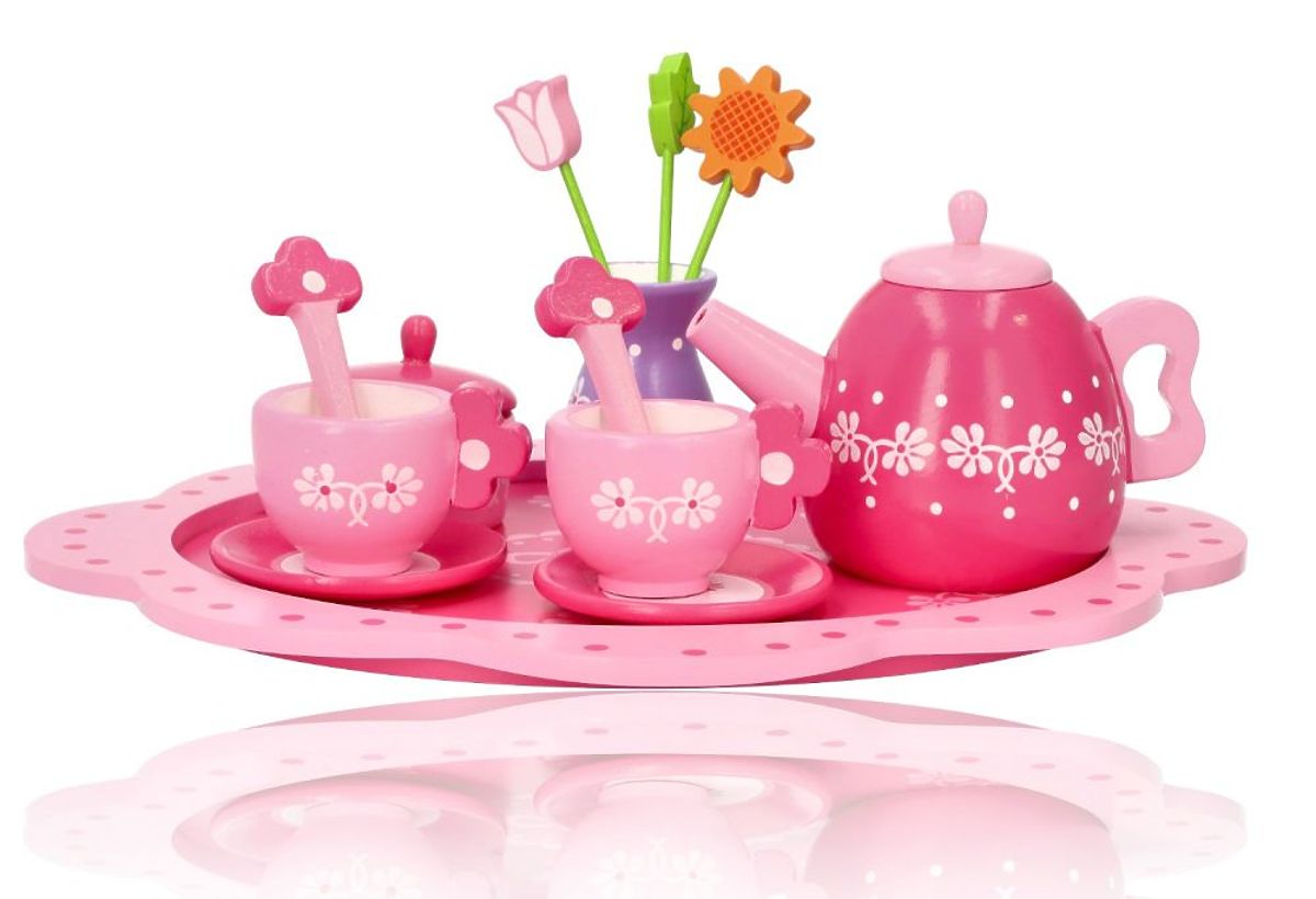 Izvrsni drveni čajni set pružit će djeci mnogo sati nevjerojatne zabave. Čajni set je idealan za piknik na svježem zraku, ali i za igru u sobi male dame. Kocke šećera u šećernici, šalice i čajnik učinit će da se svaka djevojčica osjeća kao prava dama koja priređuje čajanku. Cijeli set se lako prenosi na drvenom pladnju.