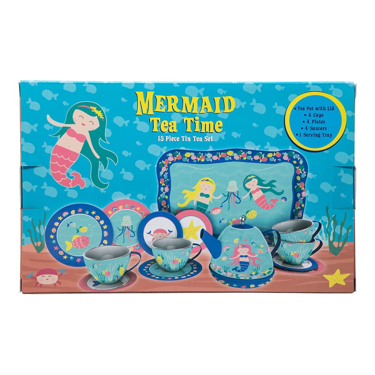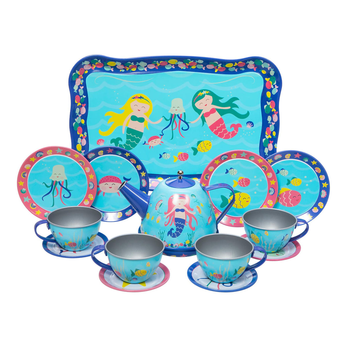 Vrijeme je za čaj. Prekrasan 15-dijelni set za čaj izrađen od metala, sadrži 4 šalice s tanjurićima, 4 desertna tanjurića, čajnik s poklopcem i poslužavni pladanj, sve u dizajnu sirena. Kreativnost raste kada vaši mališani ugoste prijatelje, lutke i plišane igračke s ovim prekrasnim setom za čaj. Pogodno za male domaćine i domaćice u dobi od 3 godine. Glavne značajke: 15-dijelni set za čaj idealan za zamišljene čajanke dizajn s motivom sirena