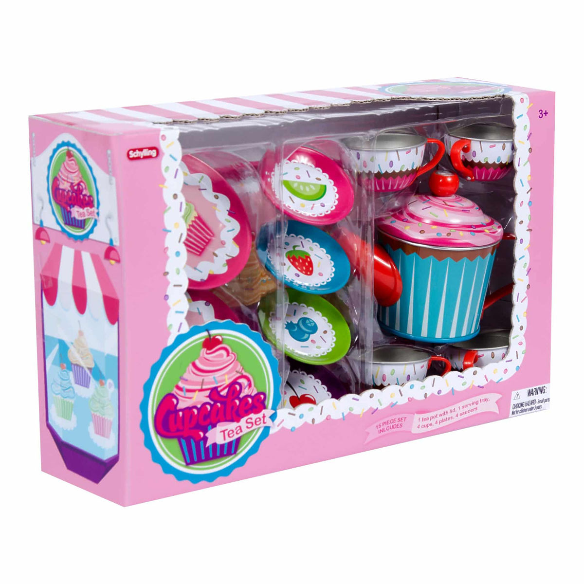 Vrijeme je za čaj. Prekrasan 15-dijelni set za čaj izrađen od metala, sadrži 4 šalice s tanjurićima, 4 desertna tanjurića, čajnik s poklopcem i poslužavni pladanj, sve u dizajnu ukrašenih muffina. Dimenzije poslužavnog pladnja su 24x16 cm. Kreativnost raste kada vaši mališani ugoste prijatelje, lutke i plišane igračke s najslađim setom za čaj svih vremena. Prikladno za male domaćine i domaćice u dobi od 3 godine. Glavne značajke: 15-dijelni set za čaj idealan za zamišljene čajanke dizajn s motivom muffina
