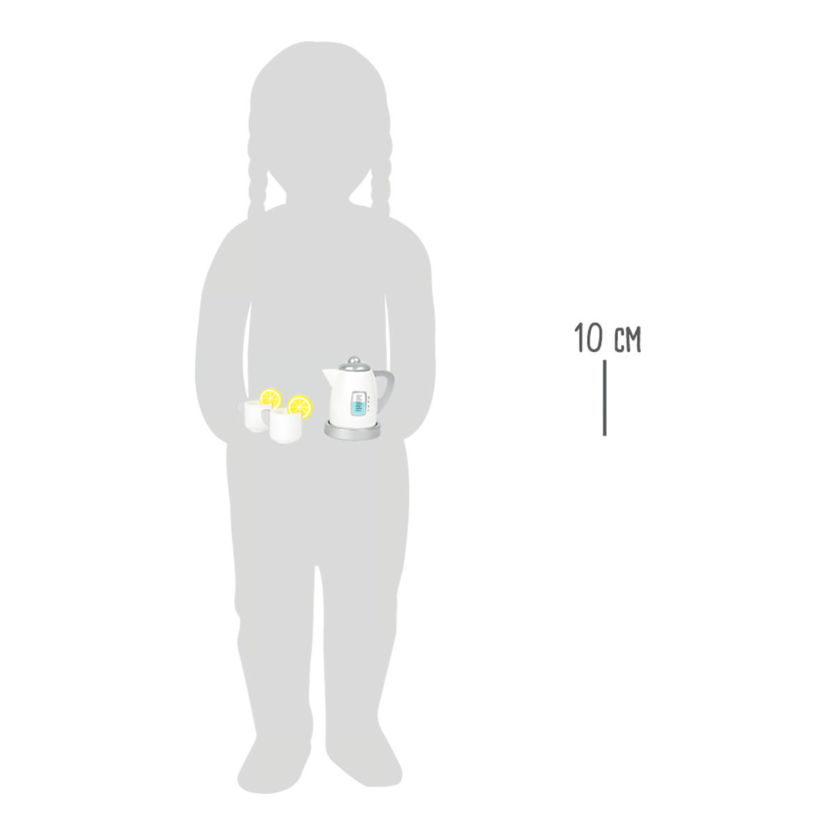 Nema ništa bolje od šalice vrućeg čaja ukrašene sočnim kriškom limuna! Naučite djecu pravilima posluživanja i društvenog ponašanja s kompletom električnog čajnika i šalica. Odlično nadopunjuje dječje kuhinje, druge servise, setove za doručak ili makete peciva i kolača. Dijelovi su izrađeni od kombinacije masivnog drva i čvrste šperploče, što igrački omogućuje visoku otpornost i trajnost. Glavne značajke: čajnik s poklopcem i postoljem, 2 šalice i 2 limuna, robusna i izdržljiva drvena izvedba