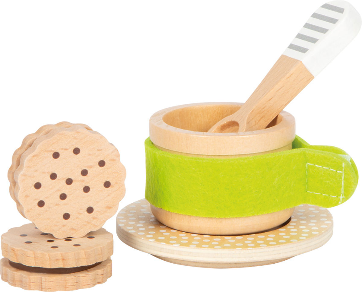 Svi ljubitelji čaja i kave, pozor. Ovaj set je dizajniran s obzirom na najmlađe domaćine koji vole oponašati odrasle u pripremi kave i čaja. Set ima prekrasan dizajn, zanimljive detalje, visok udio drvenih materijala i taktilno ugodne komade od filca. Dvije šalice s tanjurićima, dvije žličice, posuda za šećer, vrč za mlijeko i veliki vrč za kavu/čaj nadopunjeni su tanjurom i sendvič keksima. Na posudi za šećer i vrču za kavu/čaj nalazi se odvojivi poklopac za još realističniju igru. Podržava razvoj mašte i socijalnih vještina. Glavne značajke: podržava kreativnost i socijalne vještine, izrađeno od drva i filcanih dodataka, izvrstan dodatak dječjoj kuhinji, taktilno ugodni komadi od filca