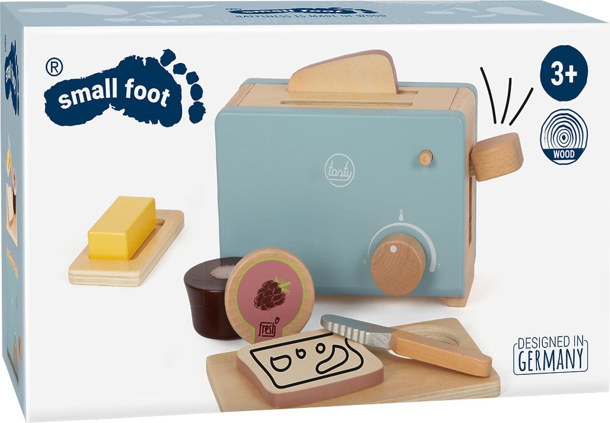 Uz ovaj toster i njegov pribor, svaki će doručak pripremljen u dječjoj kuhinji biti hit! Ima funkciju iskakanja i nježan dizajn u dimno plavoj i bijeloj boji, a igračka također sadrži mnogo prirodnog drva. Među bogatim priborom pronaći ćete kriške tosta, nož, maslac, marmeladu, što će pomoći u realistično igri! Toster ima rotirajuće i pokretne gumbe, polugu. Kriške tosta umetnite u toster pomoću velike poluge sa strane, a na isti način ih i izvadite. Djeca mogu postaviti temperaturu pomoću rotirajućeg kliktajućeg gumba. Dasku za doručak možete objesiti zahvaljujući otvoru, čime zauzima manje prostora pri skladištenju. Ovaj set ima šareni dizajn kompatibilan s drugim proizvodima iz serije Tasty od Small Foot, kao što je Drvena kuhinja LE12216. Glavne značajke: drveni toster s funkcijom iskakanja bogat pribor – kriške tosta, nož, daska, maslac, marmelada rotirajući kliktajući gumb u izrezu daske savršeno stane marmelada odgovara drugim proizvodima iz linije Tasty tijekom maštovite igre trenira svakodnevne i socijalne vještine