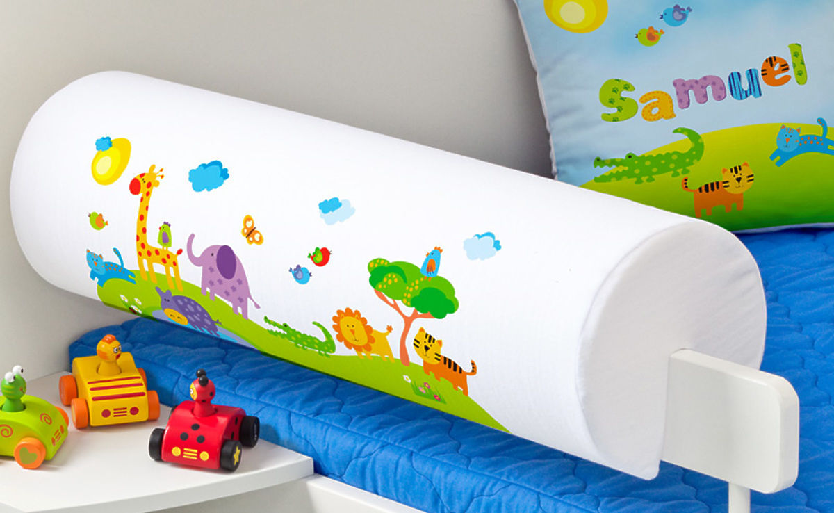 Štitnik za krevet, koji klizi na sigurnosni sustav za dijete, služi za zaštitu djeteta od masivnog drva dječjeg sigurnosnog sustava. Sigurnosna je i dekorativna, služi kao udoban naslon za leđa i štiti od udara. Otisak ovog poliuretanskog štitnika nalazi se na obje strane i odgovara ostalim proizvodima iz ove serije. Poklopac zaštitnika je patentnim zatvaračem i stoga se može prati.