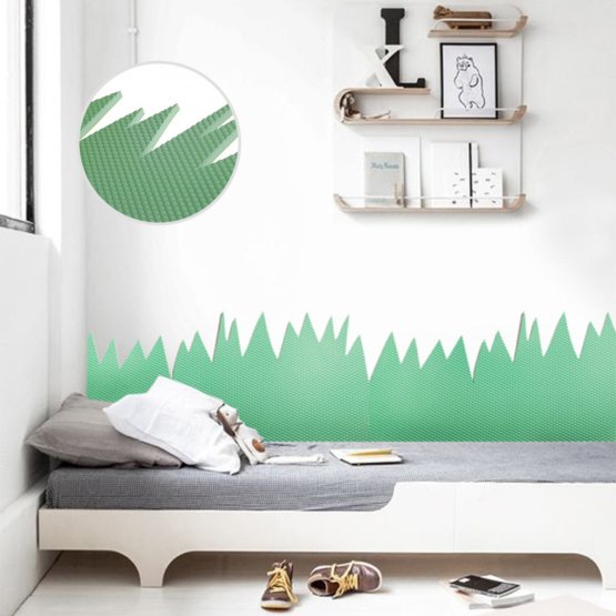 Pjenasta zaštita zida iza kreveta u obliku rastresite trave čini prostor za spavanje ugodnim, a djeci pruža ugodan i siguran san. Mekana pjena izolira od hladnoće hladnog zida i također štiti zid od neželjenih oštećenja.