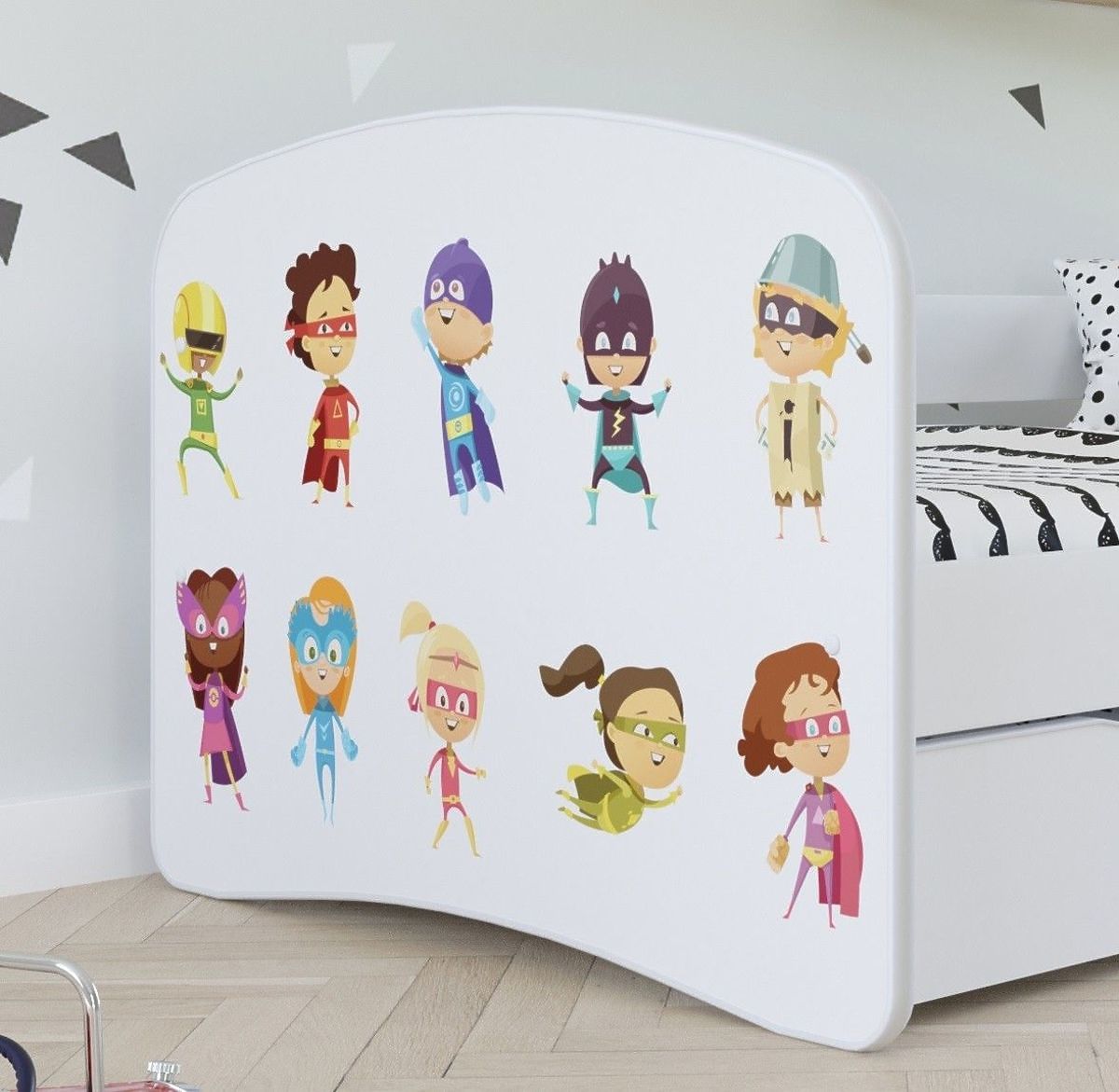 Dětská postel s obrázkem deseti malých superhrdinů na bílém pozadí. Každý hrdina má originální superoblek. Je jen na dětské fantazii, jakou superschopnost každému z nich vymyslí. Postel je vhodná do dětského pokoje pro kluky i holky.