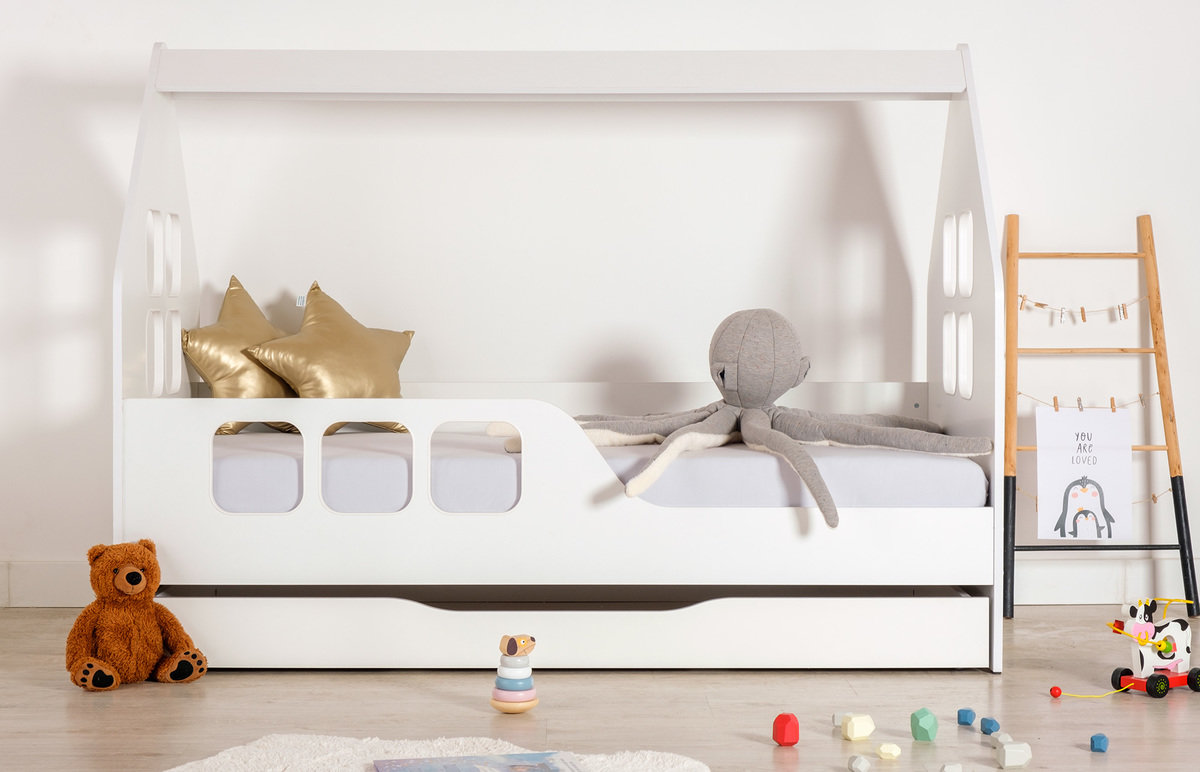 Bijela krevet Woody u obliku kućice s prozorima dimenzija 160 x 80 cm. Ovaj originalni dizajn kreveta u obliku kućice postat će prekrasan dominantni element dječje sobe. Tijekom dana služi kao udoban kutak, a noću stvara sigurno mjesto za spavanje.