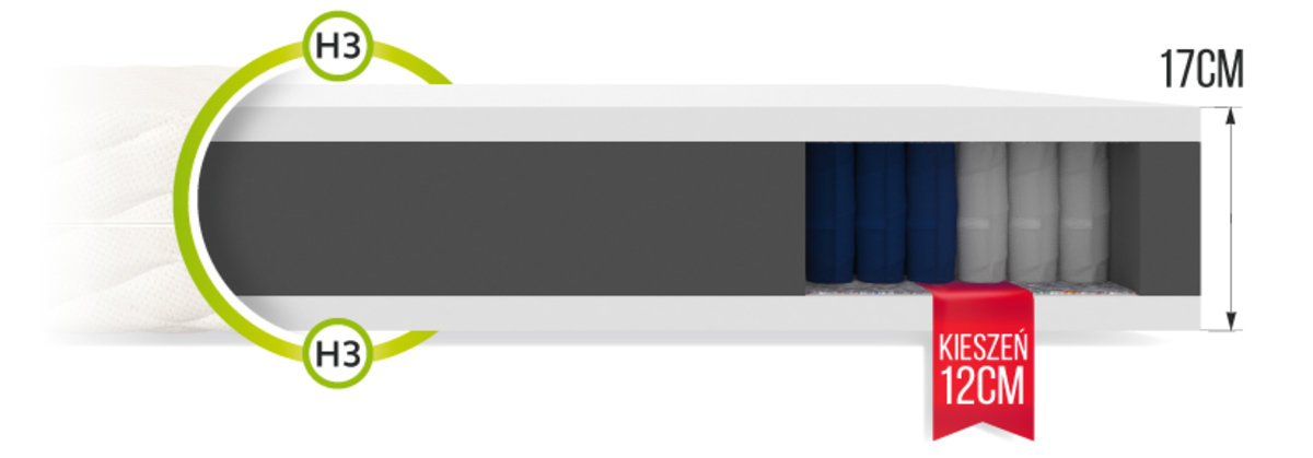Osigurajte si udoban i neometan san s obostrano džepičastom madracom TREVISO visine 17 cm. Jezgra madraca je džepičasta. Džepičaste opruge izrađene su tehnologijom NanoHARD i zahvaljujući dvostruko kaljenoj žici značajno se produžuje njihov vijek trajanja. Madrac se odlikuje 7 zona različite tvrdoće, što osigurava ergonomsku poziciju tijela tijekom odmora. Opruge rade neovisno jedna o drugoj, što eliminira efekt savijanja velike površine madraca pod pritiskom na mali dio. Zbog toga nećete osjetiti okretanje ili pomicanje druge osobe, što osigurava dubok i neometan san. Džepičasta jezgra okružena je pur pjenom T25, koja ima visoku otpornost na deformacije, elastična je, dobro prozračna i stabilizira tijelo tijekom odmora. Između opruga i pjene umetnut je odvojni materijal. Radi se o prirodnom filcu, koji može značajno produžiti vijek trajanja madraca i ojačati njegovu konstrukciju.