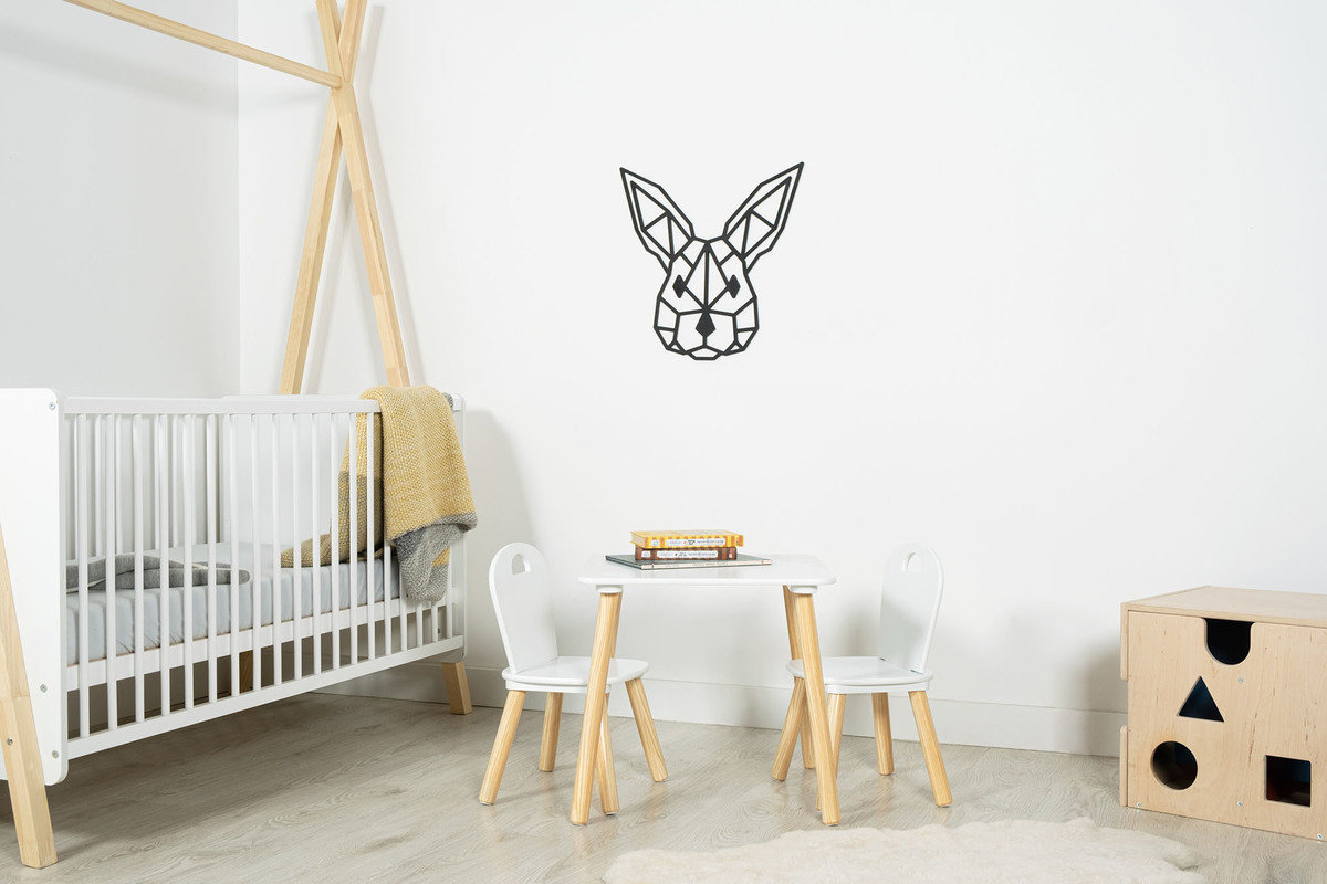 Drveni geometrijski lik u obliku zeca. Viseći ukras od šperploče prikladan je za dječju sobu u skandinavskom stilu.