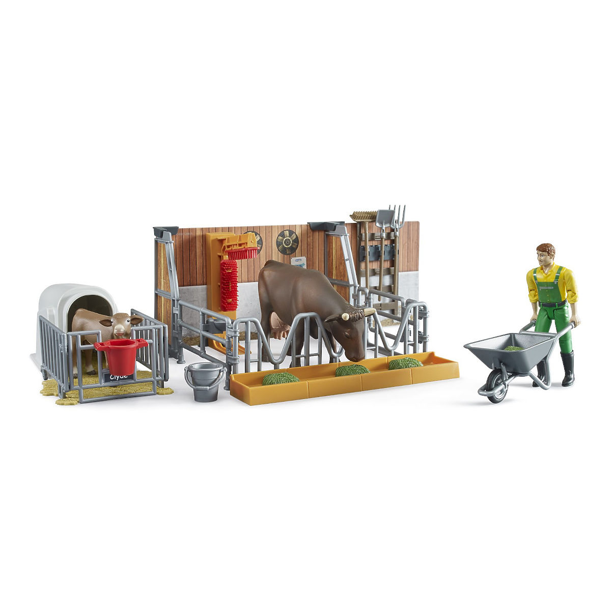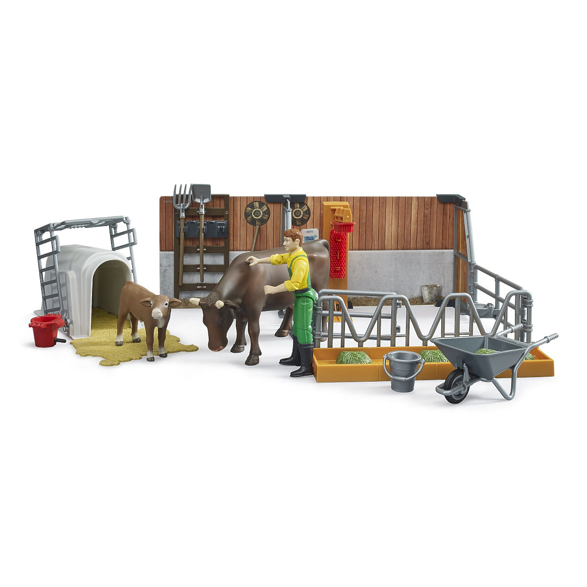 Omogućite djeci da postanu mali farmeri koji neumorno brinu o domaćim životinjama. Set za smještaj životinja nudi dva boksa, mali s teletom i veliki prostrani boks s kravom. Opremljeni su svim potrebnim priborom za napajanje i hranjenje stoke, koritom, pojilom i hranilicom. Udobnost životinja povećava mali nadstrešak, masažna četka i naravno marljivi farmer, kojem je na raspolaganju sav potreban alat, od vila do kolica. Zahvaljujući varijabilnim građevinskim dijelovima, djeca lako mogu integrirati staju među ostale BWORLD dodatke. Mjerilo je prilagođeno tako da se set može dopuniti bilo kojim BRUDER modelom, bilo da se radi o traktoru ili utovarivaču. Proizvedeno u Njemačkoj, od kvalitetnih materijala. Glavne značajke: pokretna figurica farmera, figurica krave i teleta, 3-dijelna obostrano tiskana kulisa staje s ogradom i mali boks s nadstrešnicom, korito, hranilica i pojilo, masažne četke i dio za vješanje alata, kolica, vile, lopata, četka i kanta, proizvedeno u Njemačkoj