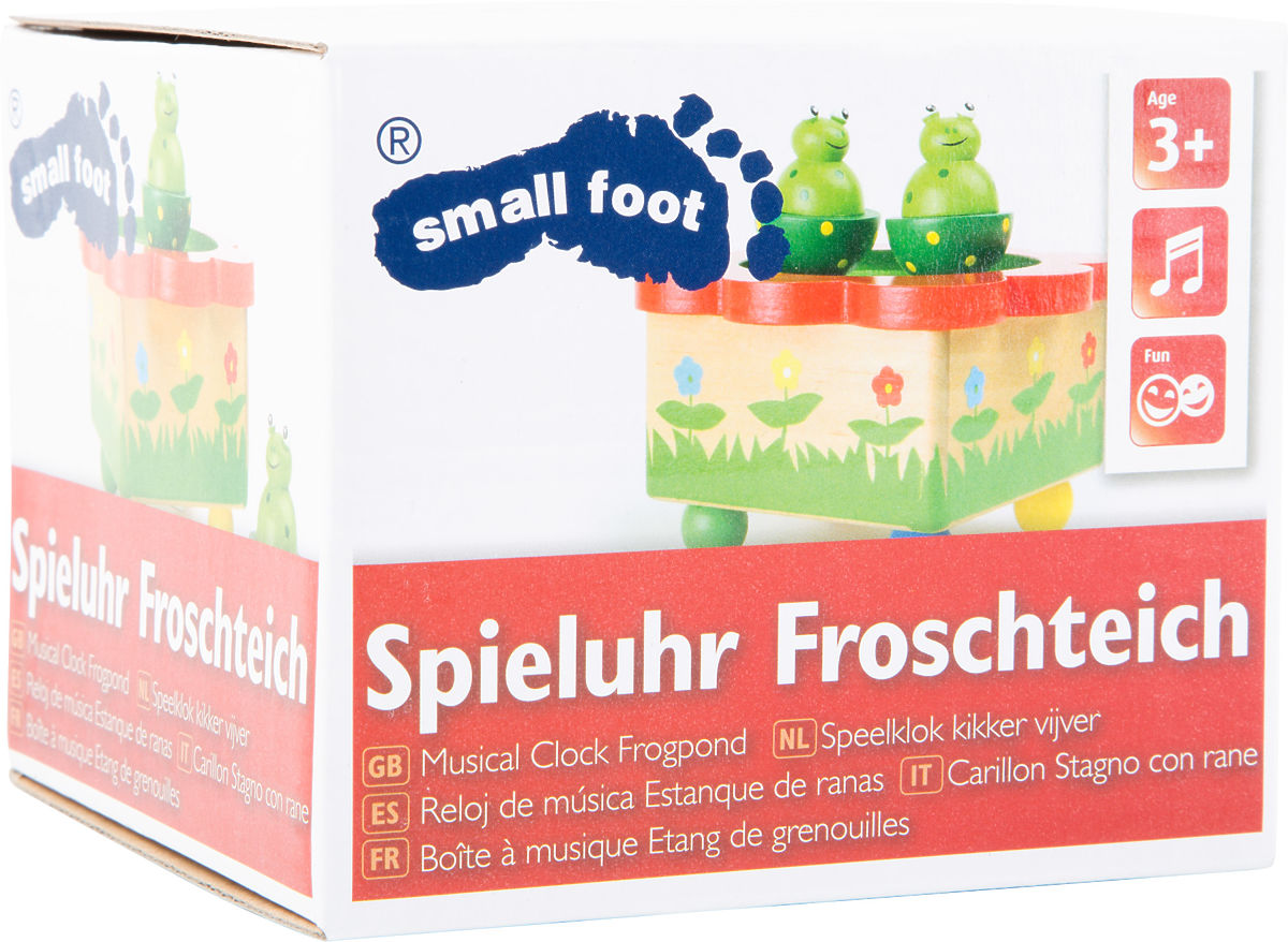 Koju pjesmu čujem? Tko to pleše? Kvaki, kvak! Žabice imaju svadbu i ti ne smiješ izostati! Male žabice sigurno stoje na vrhu drvene glazbene kutije na navijanje pomoću magneta. Mogu se lako odvojiti i djeca se s njima mogu igrati na podu, stolu ili krevetiću. Zahvaljujući jednostavnom upravljanju, ovu glazbenu kutiju mogu samostalno koristiti i djeca. Glavne značajke: jednostavno upravljanje, potiče maštu, svira melodiju "Merrily We Roll Along"