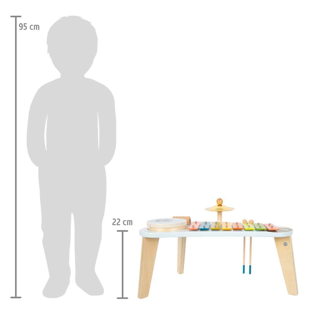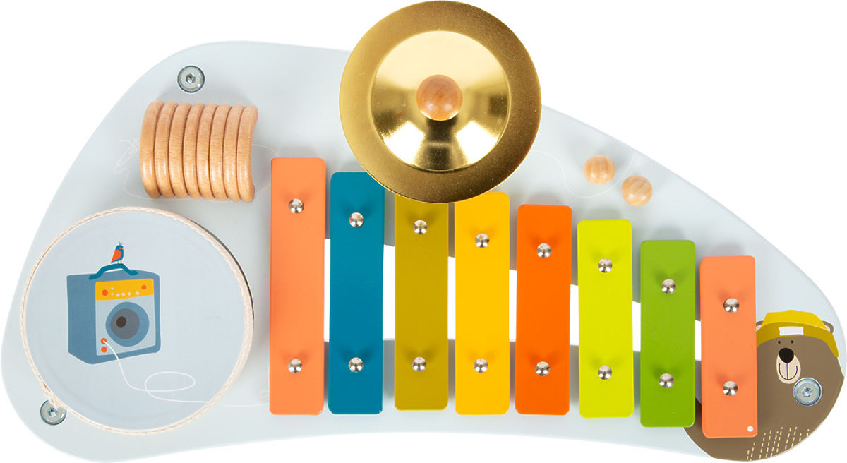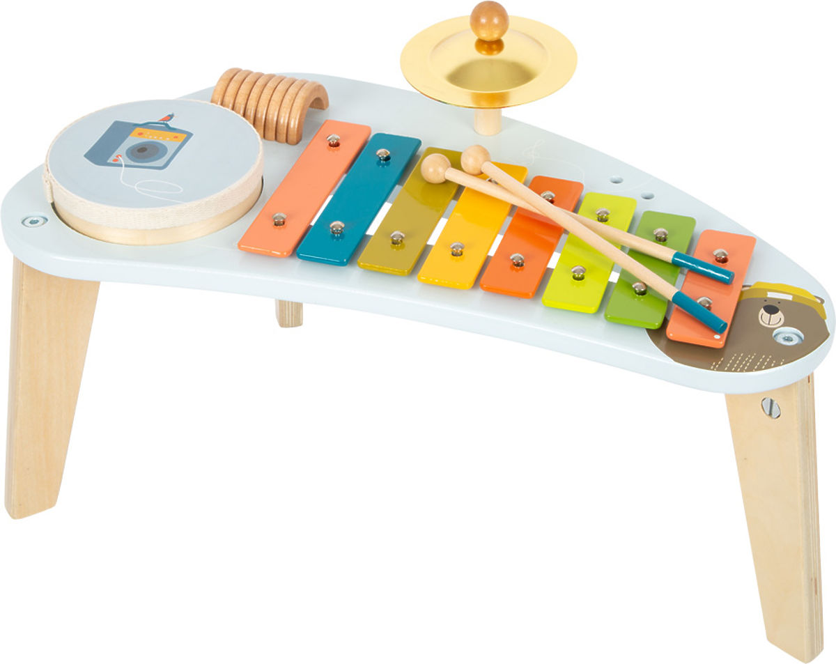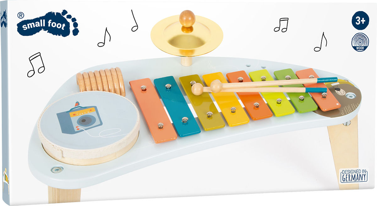 Medo Bruno stvara glazbu! Ovaj čvrsto izrađeni glazbeni stolić stoji na tri noge i potiče djecu da sviraju razne instrumente i otkrivaju nove zvukove s činelama, ksilofonom, zvečkom i odvojivim bubnjem. Tipke ksilofona su različitih boja, što olakšava djeci sviranje prvih pjesama! Dolazi s čvrstim palicama od masivnog drva i notama. To je puno motivirajuće glazbe i zabavnog učenja! Vizualno, ovaj glazbeni i zvučni stolić ističe se svojim veselim dizajnom i harmoničnom kombinacijom prirodnog drva i modernih plavih boja! Osim vježbanja akustičkog opažanja, ovaj instrument razigrano trenira i osjećaj za ritam, ritmiku i prvo razumijevanje glazbenih tonova. Glavne značajke: Razvija finu motoriku i kreativnost Razigrani uvod u svijet zvuka i ritma Tipke ksilofona proizvode različite tonove Stolić sve u jednom