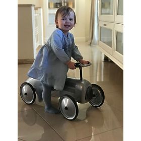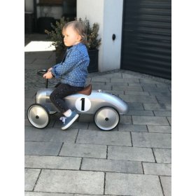Automobil ima čvrstu metalnu konstrukciju, upravljač koji se može rotirati i plastično tapecirano sjedalo za maksimalnu udobnost u vožnji. Sve je izrađeno u srebru u stilu 30-ih. Igračka pouzdano potiče dijete na kretanje i razvija njegove vještine kretanja. Automobil možete povesti sa sobom u šetnju, ali zahvaljujući gumenim kotačima koji štite pod od ogrebotina, pogodan je i za stan.
