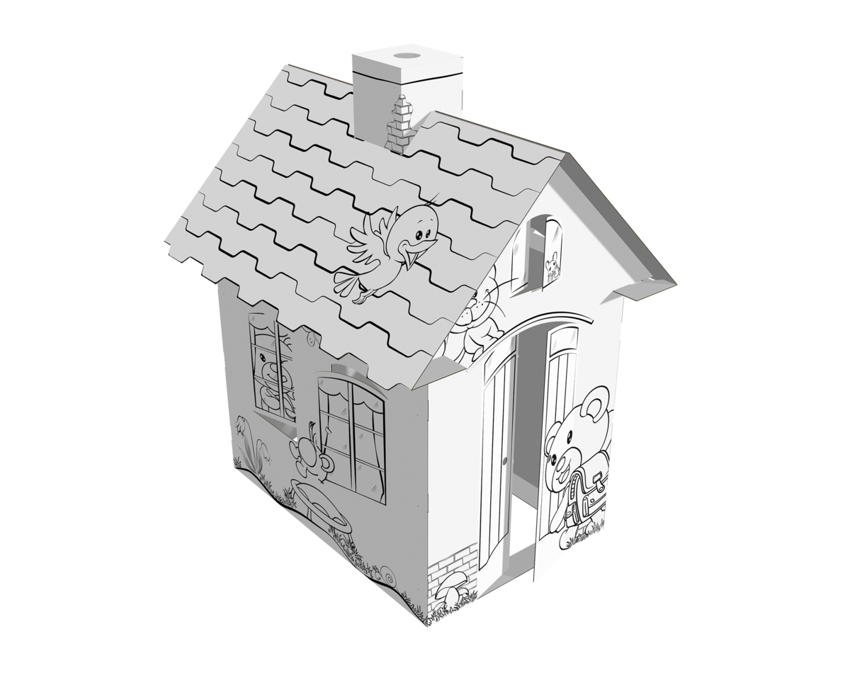 Kartonska kućica s motivom Medvjeda. Kuća ima otvorena vrata i prozore. Na krovu kuće nalazi se dimnjak. Tisak kuće je crno-bijeli i stoga se dizajn boja temelji na mašti djeteta i njegovih najmilijih.
