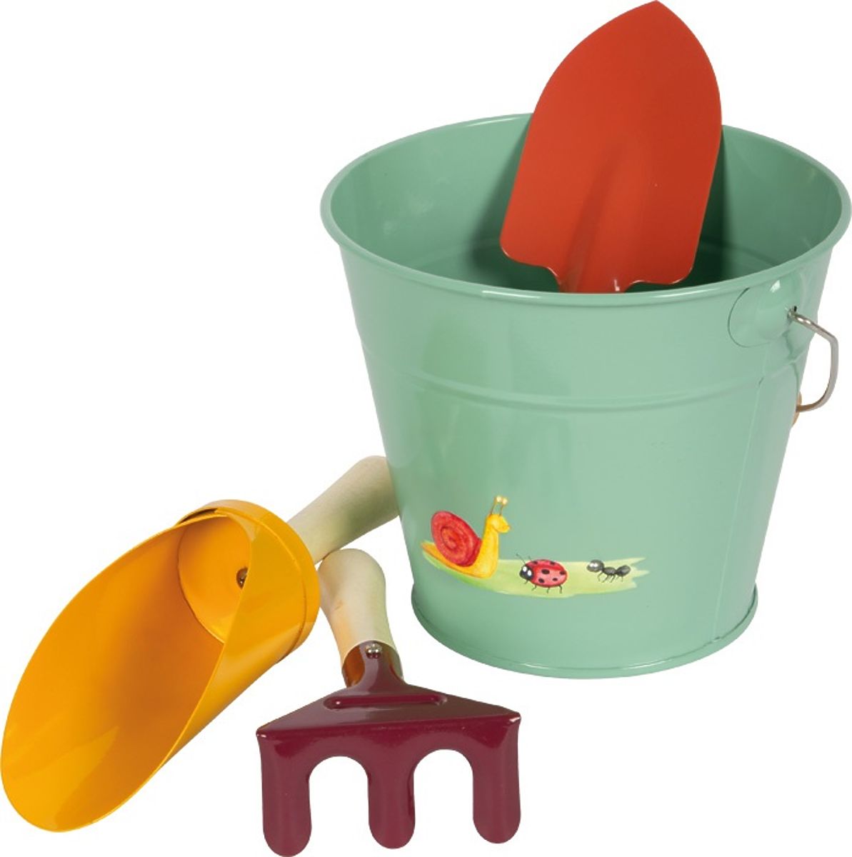 Set sadrži: 4 komada (2x lopatica, grablje, metalna kanta)