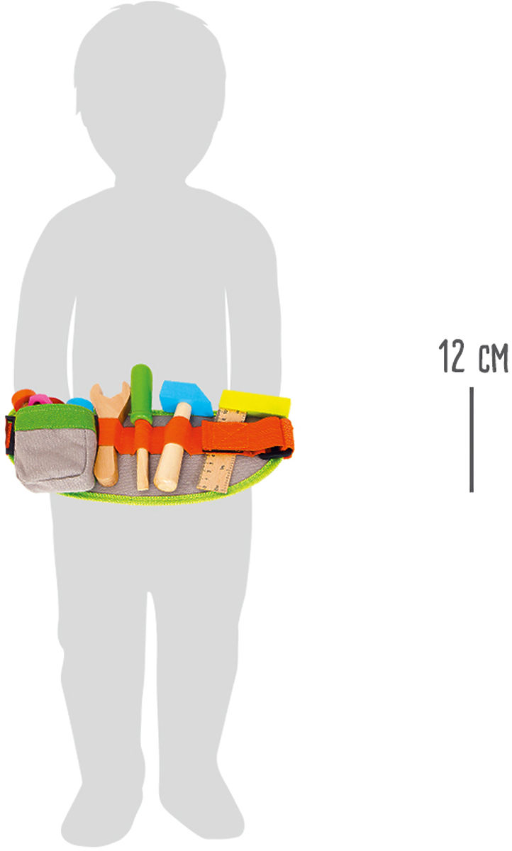 Praktični pojas za alat s podesivom duljinom izvrstan je pomoćnik za malog majstora. Set sadrži mnogo šarenog lakiranog drvenog alata – čekić, odvijač, ključ, .. više