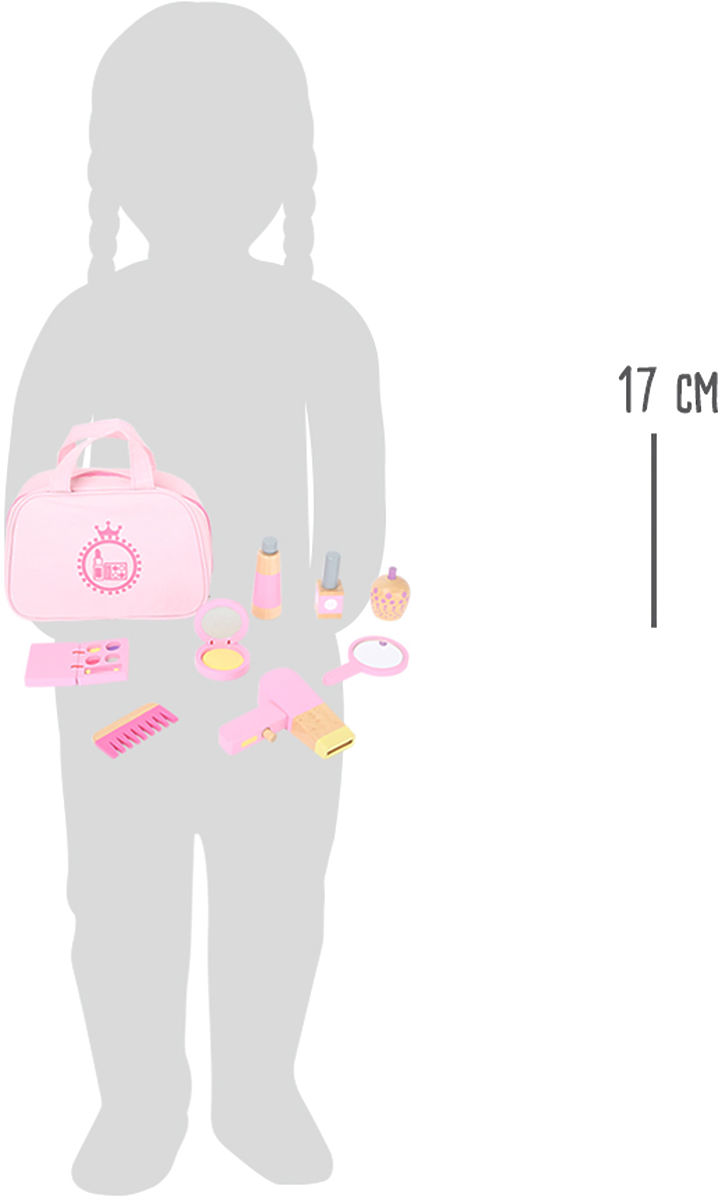 Ogledalo, ogledalo, tko je najljepši... u ovoj dječjoj sobi? Natjecanje ljepote može započeti s ovom slatkom kozmetičkom torbicom punom ružičastih drvenih dodataka. Sušilo za kosu, češalj, lak za nokte i parfem, puder i sjenilo za oči su ono što bi mlada modna ikona trebala imati. Bočice od lakiranog drva uredno stanu u prijenosnu torbicu. Glavne značajke: sadrži torbicu i 8 komada dodataka, potiče igru uloga