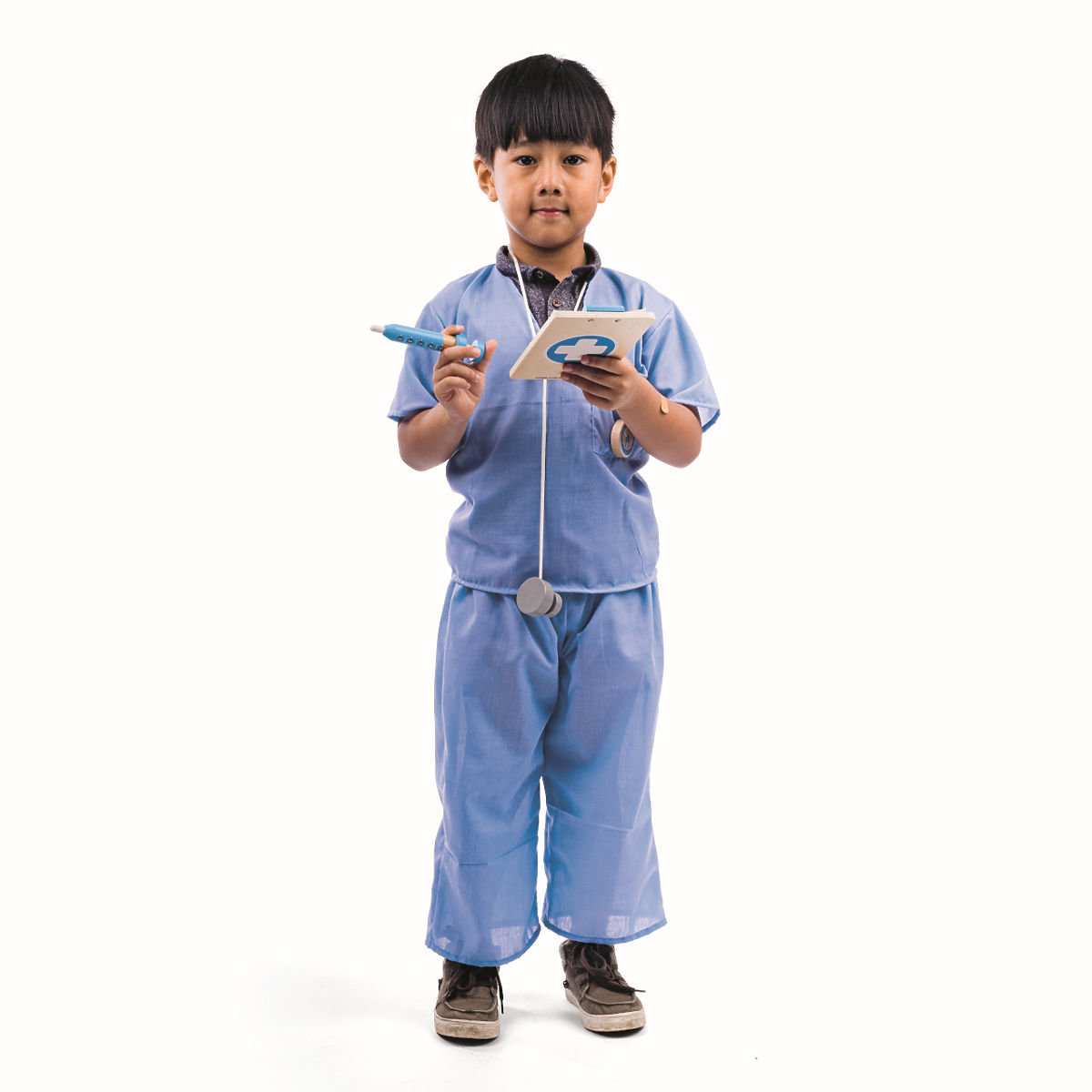 Pomozite djeci da liječe medvjediće, lutke ili članove obitelji s ovim realističnim liječničkim kostimom za djecu. Ovaj liječnički kostim uključuje plavu majicu, hlače, drveni stetoskop, liječničke ploče za bilježenje dijagnostičkih napomena, termometar, džepni sat i špricu, kao i zavoje. Čičak trake omogućuju lako oblačenje i skidanje kostima. Kostim je izrađen od pamuka i poliestera, može se prati u perilici. Glavne značajke: za liječenje bolesnih medvjedića ili lutaka, pomaže u razvoju mašte, govora i socijalnih vještina, pomaže u smanjenju straha i briga od posjeta liječniku.