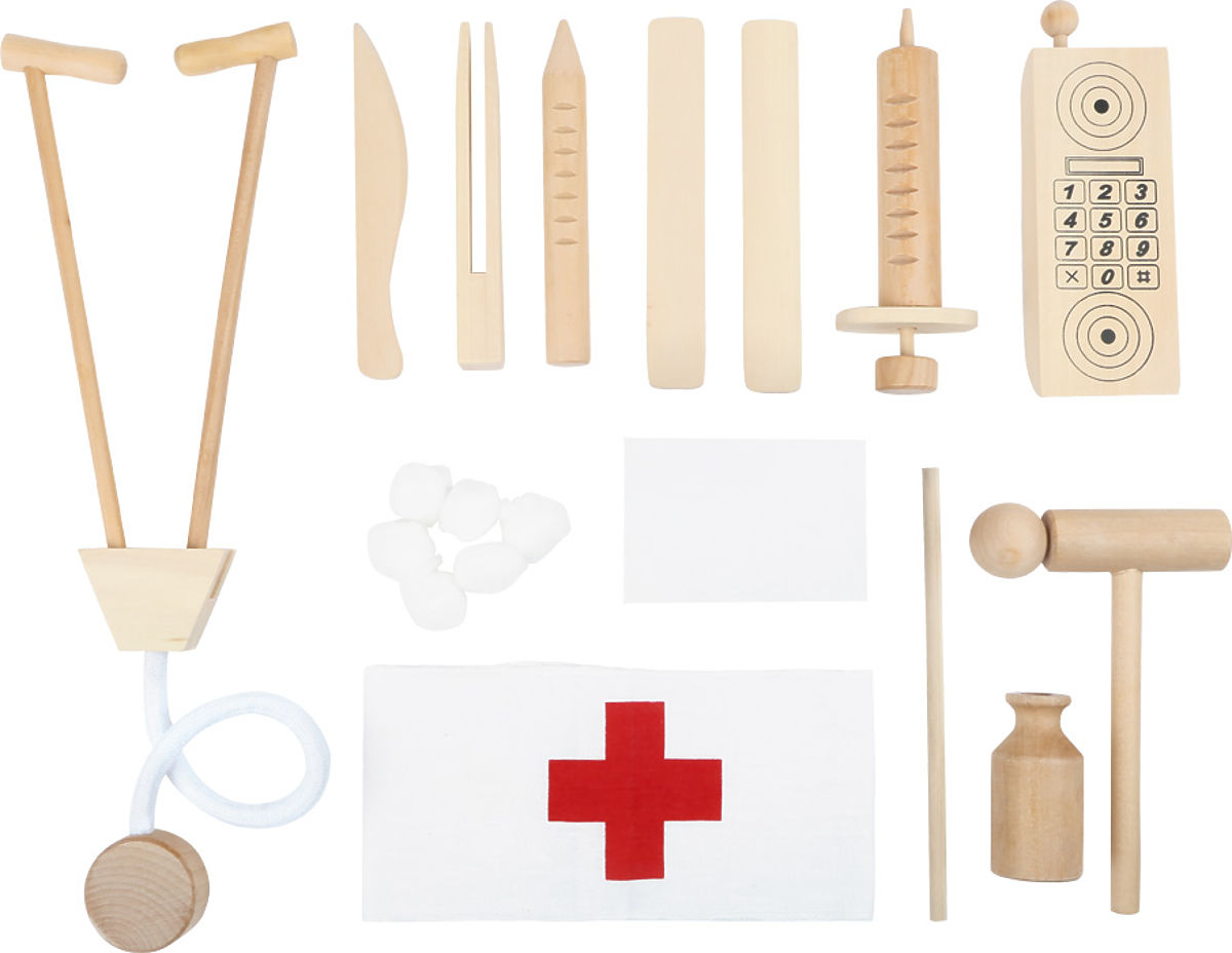 Kvalitetan drveni kovčeg s bogatim sadržajem. Ovaj kovčeg sadrži sve što liječnik treba: razne alate, hitni telefon, pa čak i injekcijske šprice. Glavne značajke: liječnički set s puno drvene medicinske opreme, fleksibilne elastične trake i odvojeni pretinci drže lijekove i medicinsku opremu na mjestu, klasični liječnički simboli, potiče aktivnu igru i razvija socijalne vještine